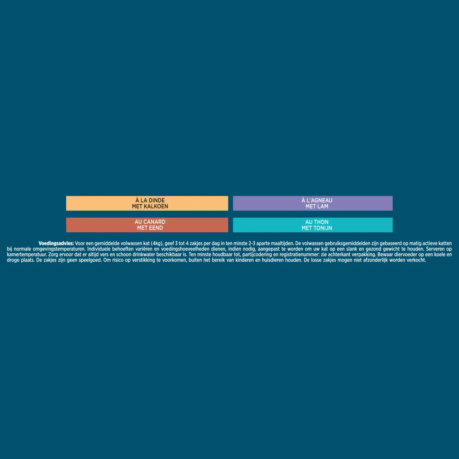 | Samenstelling | Vlees en dierlijke bijproducten (waarvan kalkoen 4%), plantaardige eiwitextracten, vis en visbijproducten, mineralen, suiker.Samenstelling: Vlees en dierlijke bijproducten, plantaardige eiwitextracten, vis en visbijproducten (waarvan tonijn 4%), mineralen, suiker.Samenstelling: Vlees en dierlijke bijproducten (waarvan eend 4%), plantaardige eiwitextracten, vis en visbijproducten, mineralen, suiker.Samenstelling: Vlees en dierlijke bijproducten (waarvan lam 4%), plantaardige eiwitextracten, vis en visbijproducten (waarvan zalm 4%),mineralen, suiker. |