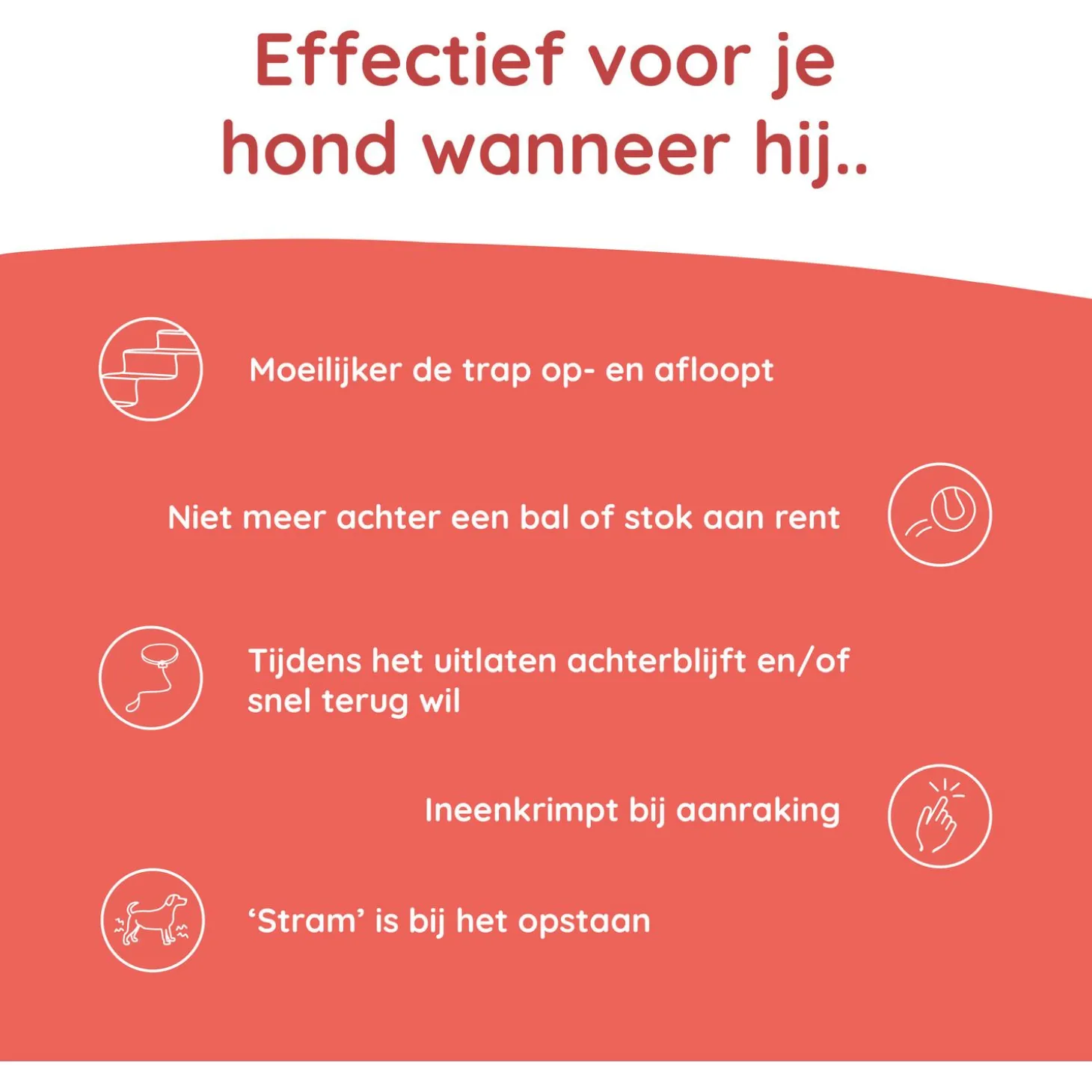 Sommige honden hebben vaak last van gewrichtsproblemen, ook wel te herkennen door slecht trap lopen, achterblijven tijdens het uitlaten, stram zijn in de ochtend of bij aanraking ineen krimpen. Dit hoeft niet altijd voor te komen bij senior honden, maar kan ook bij jonge honden voorkomen door bijvoorbeeld een ongelukje, een snelle groeispurt of omdat het erfelijk is.