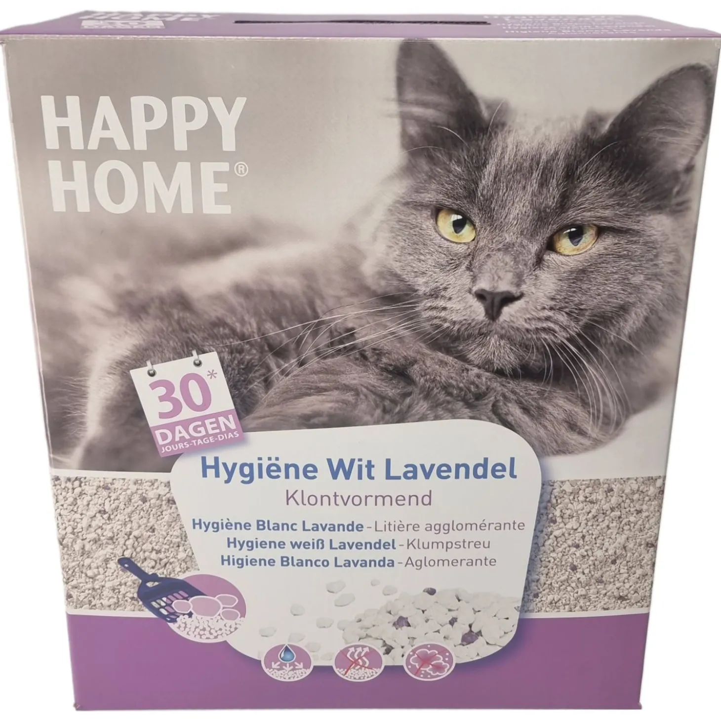 Happy Home Hygiëne Wit Lavendel is een witte, goed absorberende kattenbakvulling. Het grit bestaat uit natuurlijke kleikorrels die verrijkt zijn met een lichte, frisse lavendelgeur.