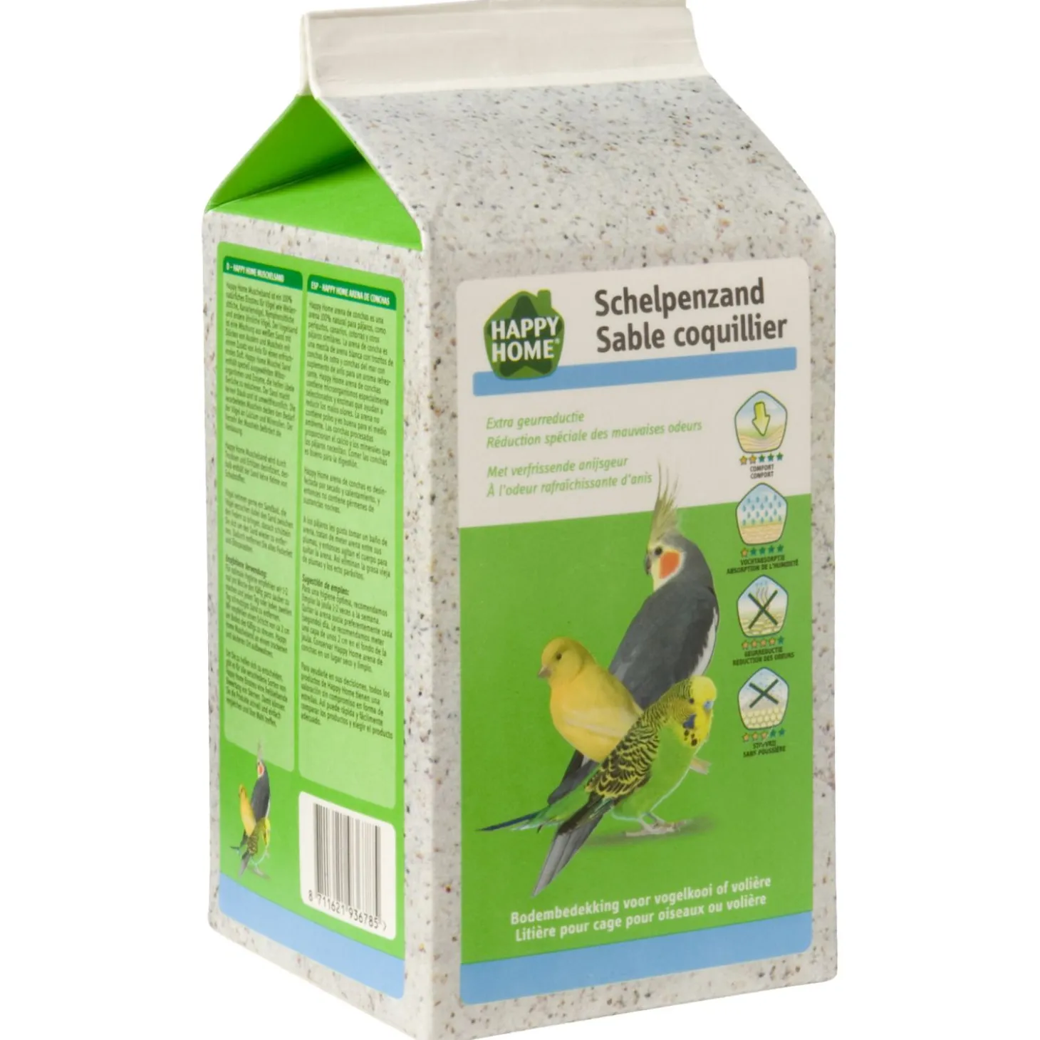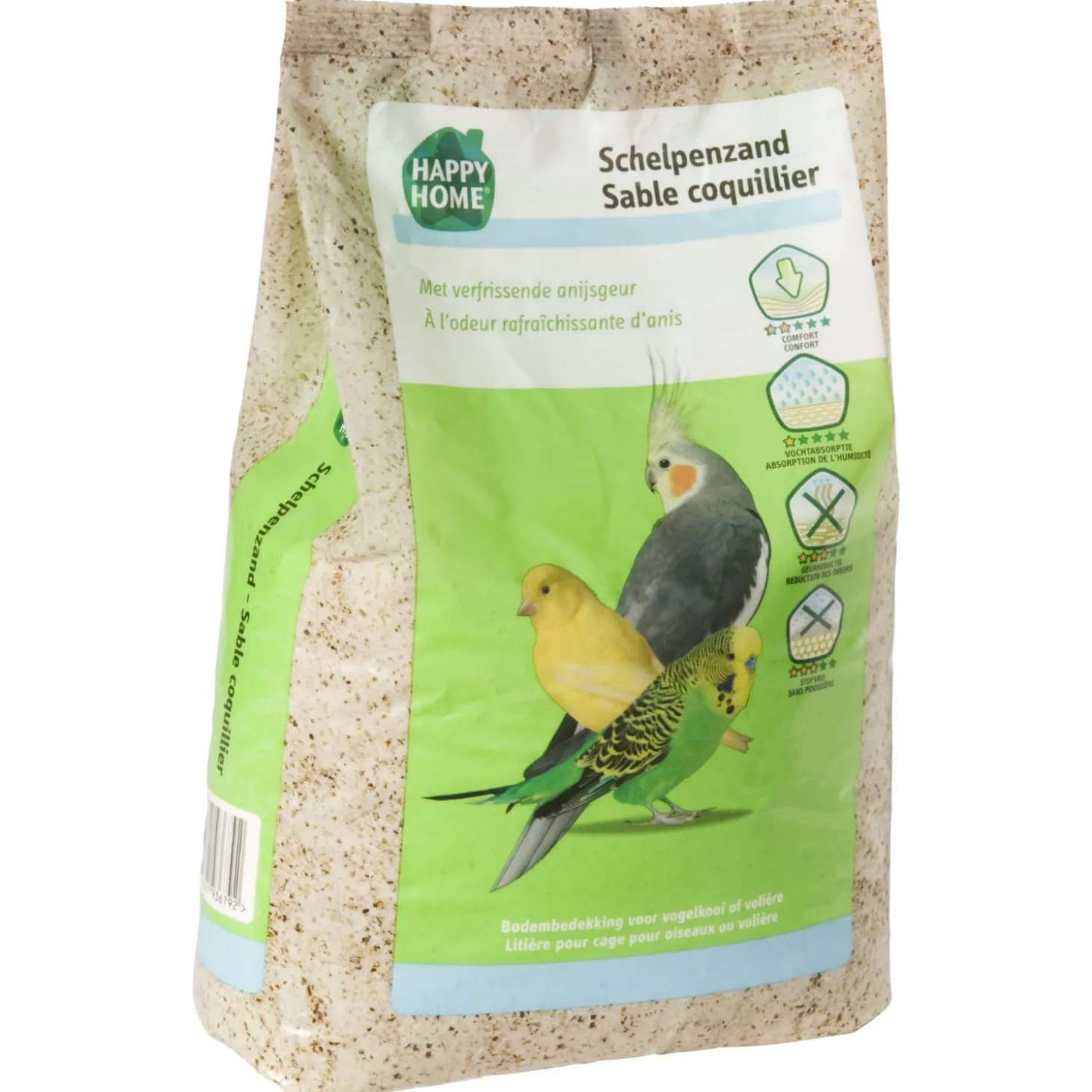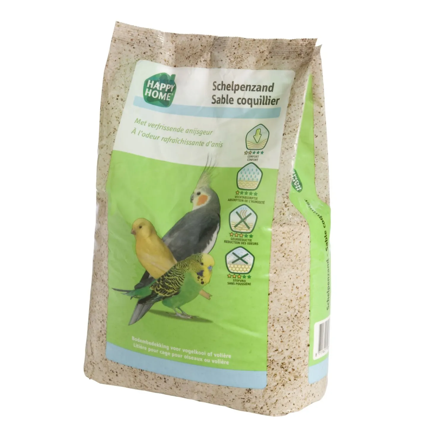 Schelpenzand is onmisbaar in iedere vogelkooi, het bevordert namelijk de hygiëne. Happy Home Schelpenzand is een mengeling van gezuiverd wit zand met oester- en zeeschelpjes. Ook is er anijs toegevoegd voor een lekkere, frisse geur.