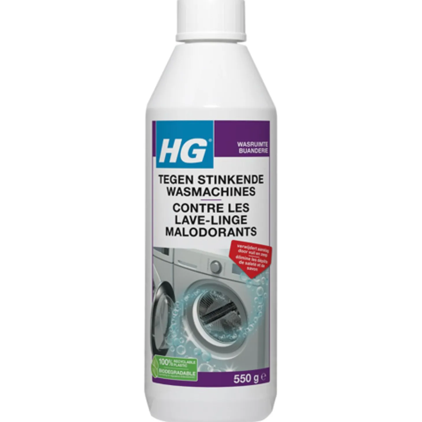 | Aanbeveling | Hoe gebruikt u HG stinkende wasmachinereiniger?Volg onderstaande stappen om zo met de HG stinkende wasmachinereiniger te zorgen voor een fris ruikende wasmachine.Zorg ervoor dat de wasmachine geen wasgoed bevatVul met behulp van een maatbeker met schaalverdeling het hoofdwasmiddelbakje met 110 gram (ca. 100 ml) van de wasmachinereiniger.Spoel de maatbeker na gebruik goed om. Vul geen extra wasmiddel toe.Stel het programma in op de stand voor bonte was bij 60 C, zonder voorwas.Zet de wasmachine aan en laat het programma zonder onderbreking geheel doorlopen.HG stinkende wasmachinereiniger |