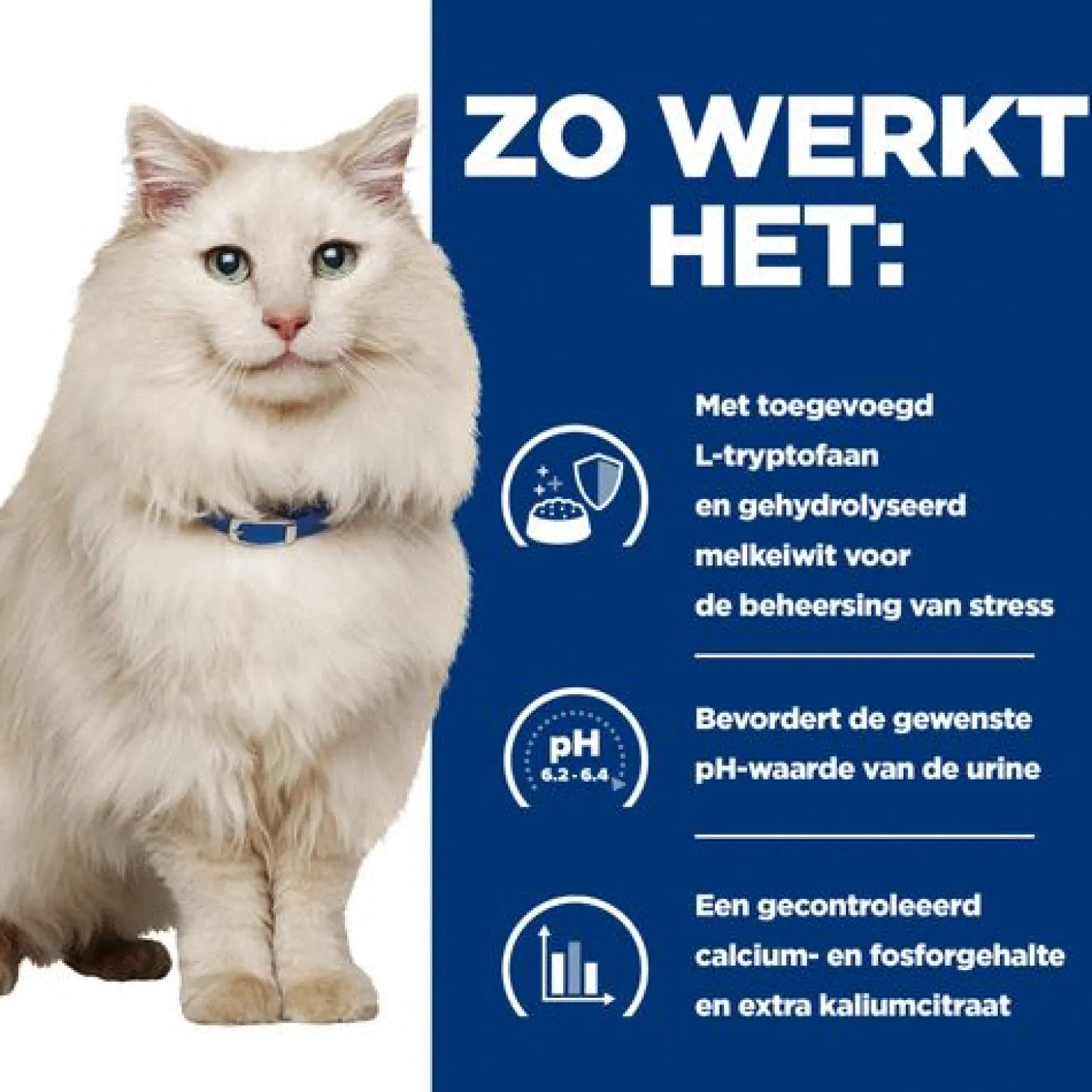 - Bevat L-tryptofaan & melkeiwithydrolysaat om stress onder controle te houden, een bekende risicofactor voor Feline Idiopathische Cystitis (FIC)****FIC is de belangrijkste oorzaak van Feline Lower Urinary Tract Disease (FLUTD)