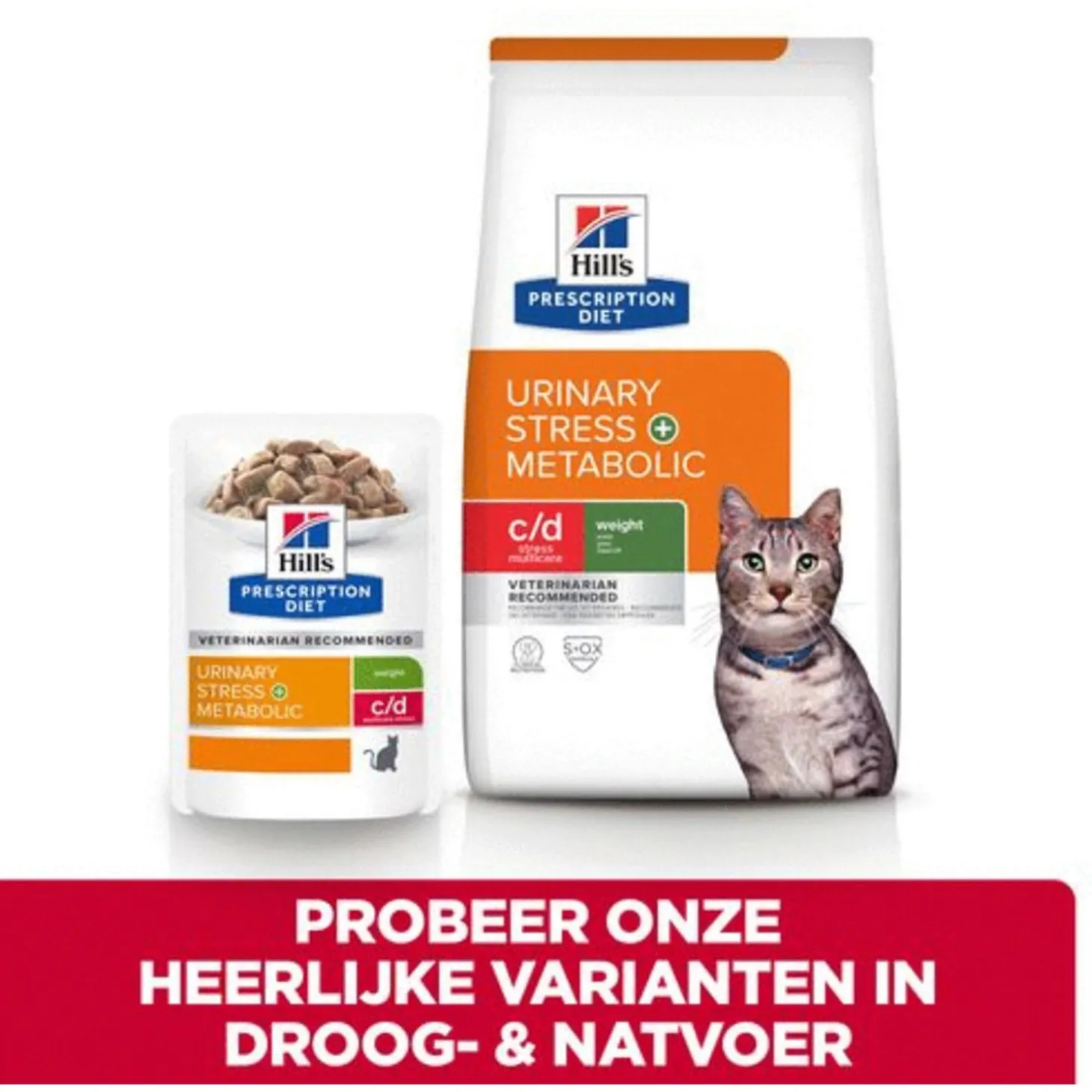 Problemen van de lage urinewegen bij de kat kunnen erg vervelend zijn. Gelukkig is er Hill’s Prescription Diet c/d Urinary Stress + Metabolic kattenvoer. Een wetenschappelijk samengestelde natvoeding met kip om stress bij katten te helpen verminderen en het gewicht onder controle te houden. Een te zware kat loopt meer risico op o.a. problemen in de lage urinewegen (FLUTD). Het natvoer zit in een handig maaltijdzakje, zo heb je elke dag een verse maaltijd.