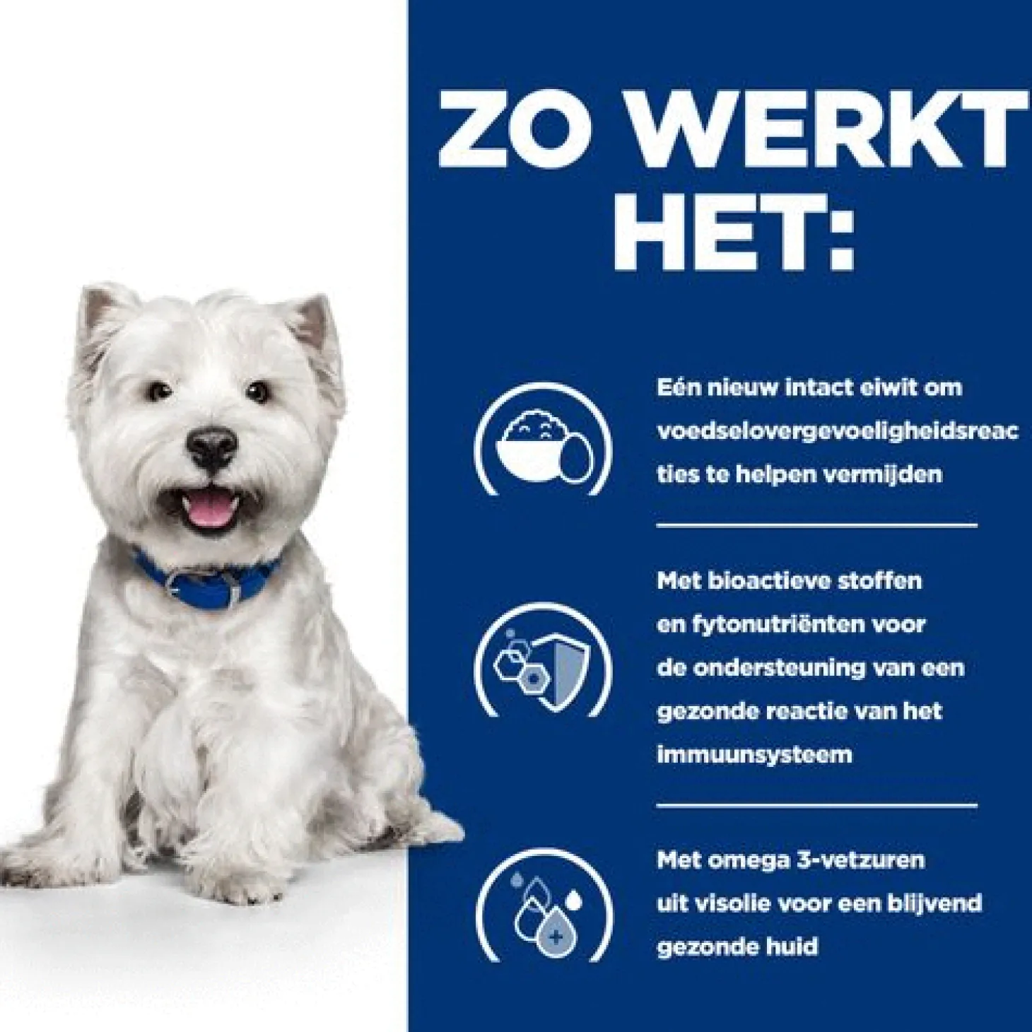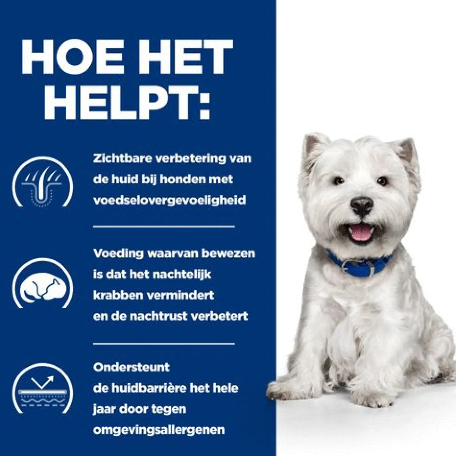 Een stap voor, voor een gelukkig leven. Hill’s PRESCRIPTION DIET Derm Complete Mini Environmental & Skin Sensitivities Droogvoer voor honden met Rijst en Ei is speciaal samengesteld door Hill’s voedingsdeskundigen en dierenartsen om de omgevings(over)gevoeligheden van je hond te helpen beheersen, en speciaal gemaakt in kleinere brokjes om te voldoen aan de behoeften van je kleinere hond of honden die de voorkeur geven aan kleinere brokjes.