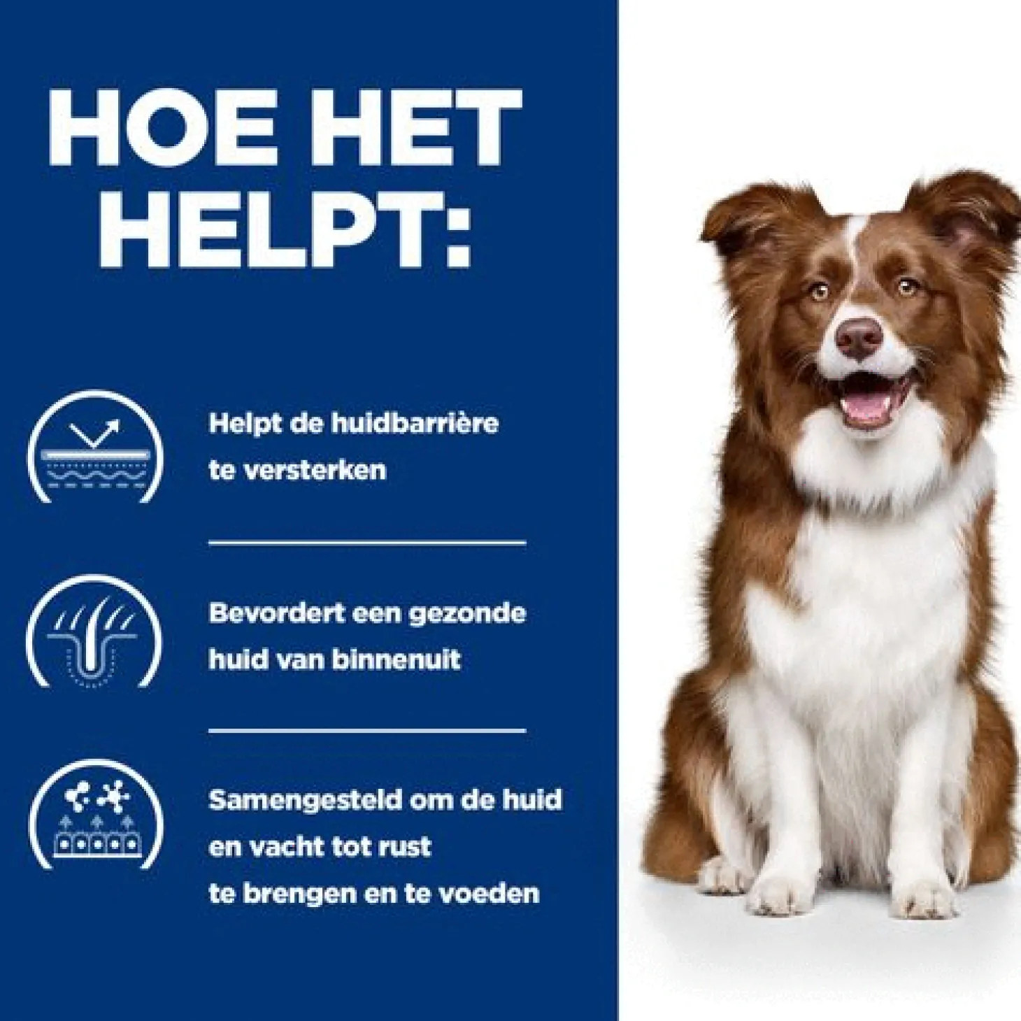 Deze complete voeding kan worden gebruikt ter ondersteuning van de huidfunctie bij huidaandoeningen en overmatige haaruitval bij volwassen honden van alle rassen. De voeding bevat een hoog gehalte aan essentiële vetzuren.