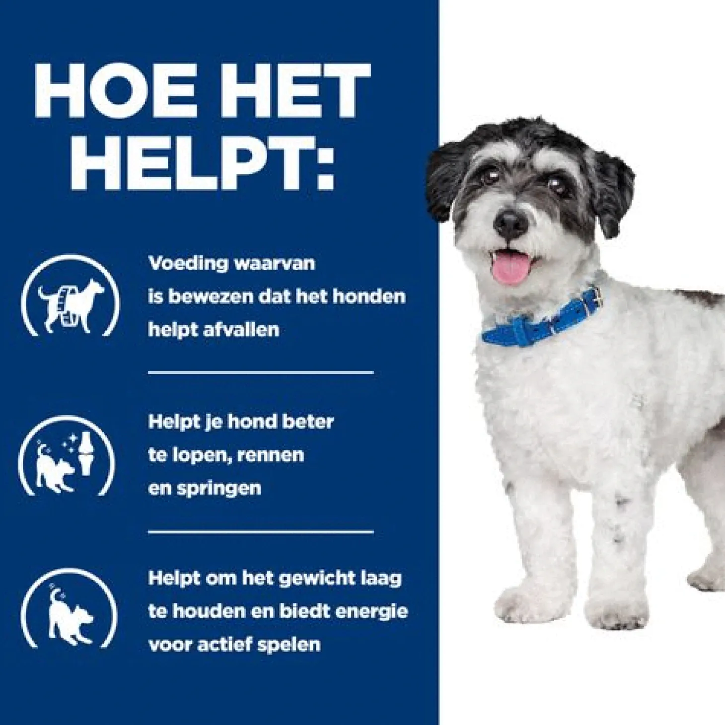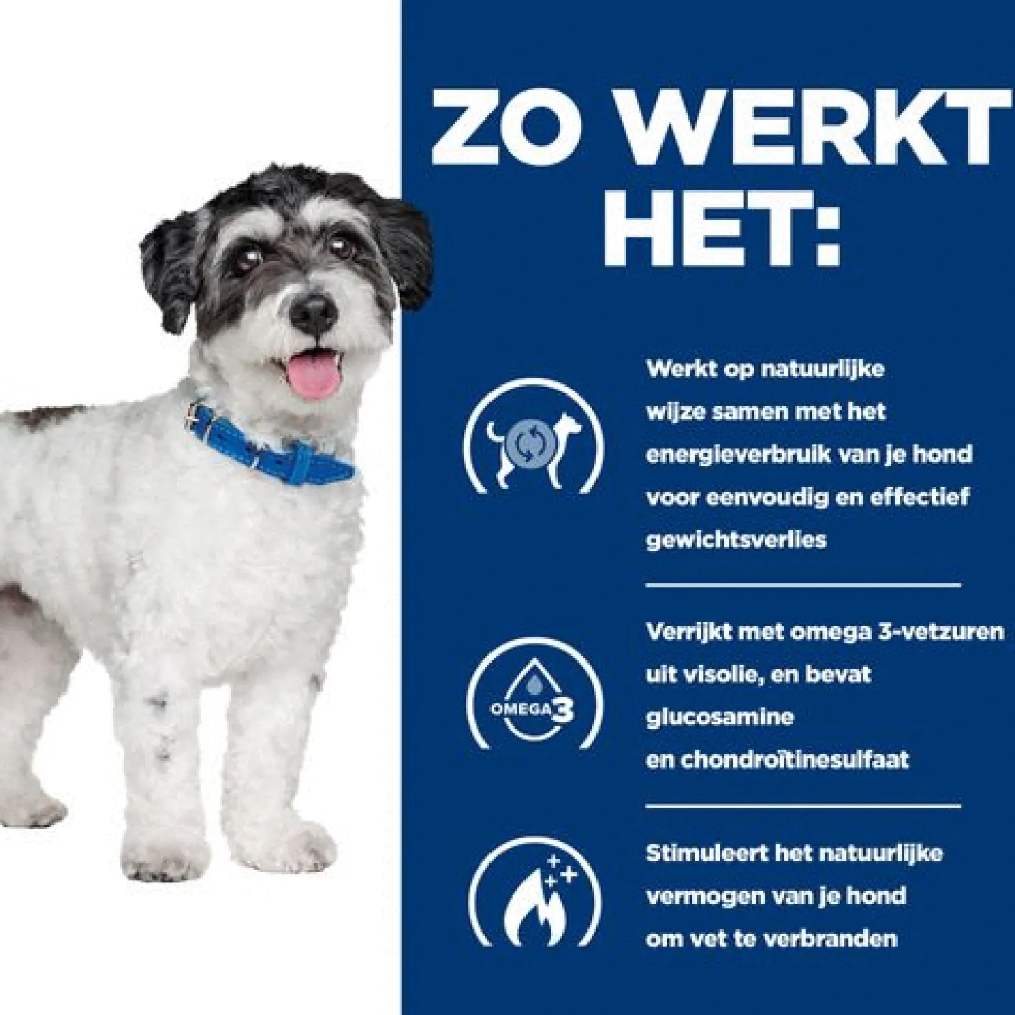 Hill’s voedingsdeskundigen en dierenartsen hebben Prescription Diet Metabolic + Mobility Mini dieetvoeding voor huisdieren ontwikkeld, speciaal samengesteld om het gewichtsbeheer en de gewrichtsgezondheid van je huisdier te ondersteunen. Werkt natuurlijk met het unieke energieverbruik van je hond voor gemakkelijk en effectief gewichtsverlies en kan langdurig worden gebruikt. In feite is Prescription Diet Metabolic + Mobility Mini klinisch bewezen voeding om honden te helpen op natuurlijke wijze gewicht te verliezen en de mobiliteit te verbeteren in slechts 21 dagen. Dit droogvoer heeft een onweerstaanbare kipsmaak waar je hond dol op zal zijn.
