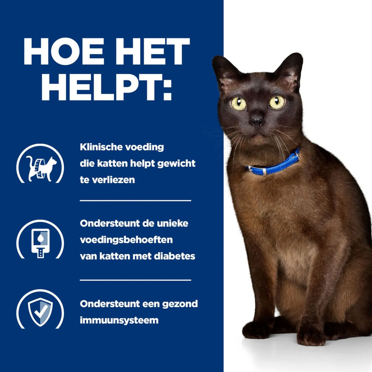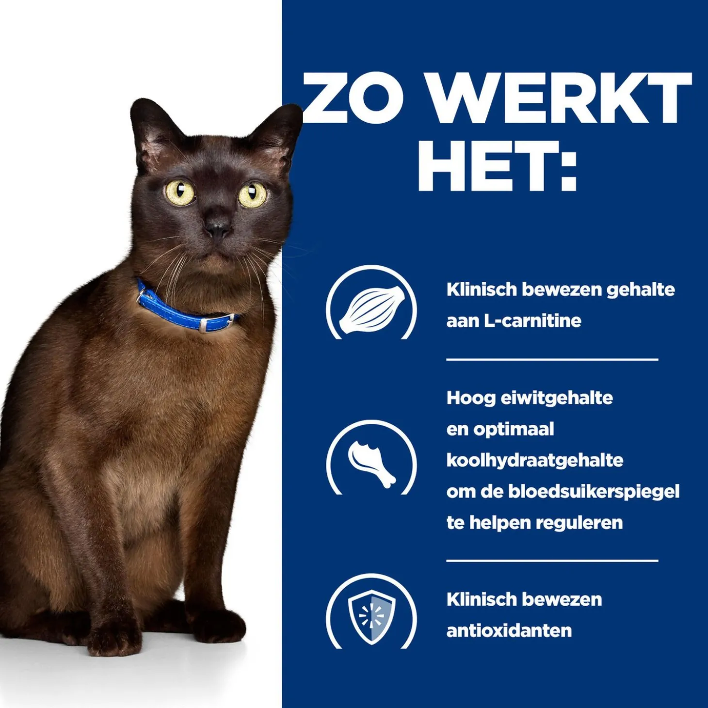 Hill’s Prescription Diet M/D Diabetes/Weight Management is een compleet en uitgebalanceerd dieetvoer, speciaal ontwikkeld door voedingsdeskundigen en dierenartsen voor katten met overgewicht en/of diabetes. Zelfs een klein beetje overgewicht kan de levenskwaliteit van je kat beïnvloeden – minder spelen, beperkte mobiliteit en gezondheidsrisico’s. Dit voer helpt niet alleen bij gewichtsverlies door de klinisch bewezen niveaus van L-carnitine, maar ondersteunt ook de unieke voedingsbehoeften van diabetische katten met zijn hoge eiwitgehalte en optimale koolhydraatgehaltes. Dankzij de S+OXSHIELD formule wordt bovendien een gezonde urinaire omgeving bevorderd die het risico op het ontwikkelen van struviet- en calciumoxalaatkristallen vermindert, wat bijdraagt aan een algehele betere gezondheid van je kat.