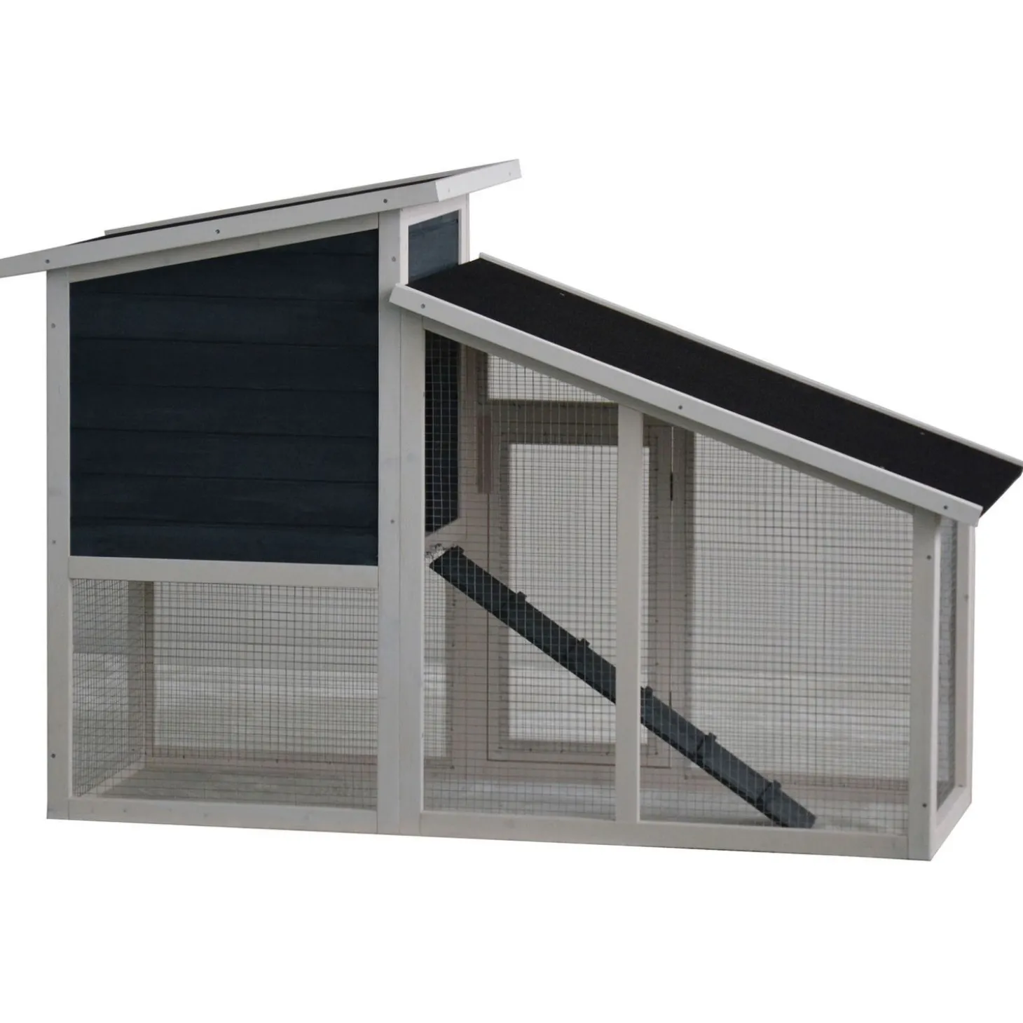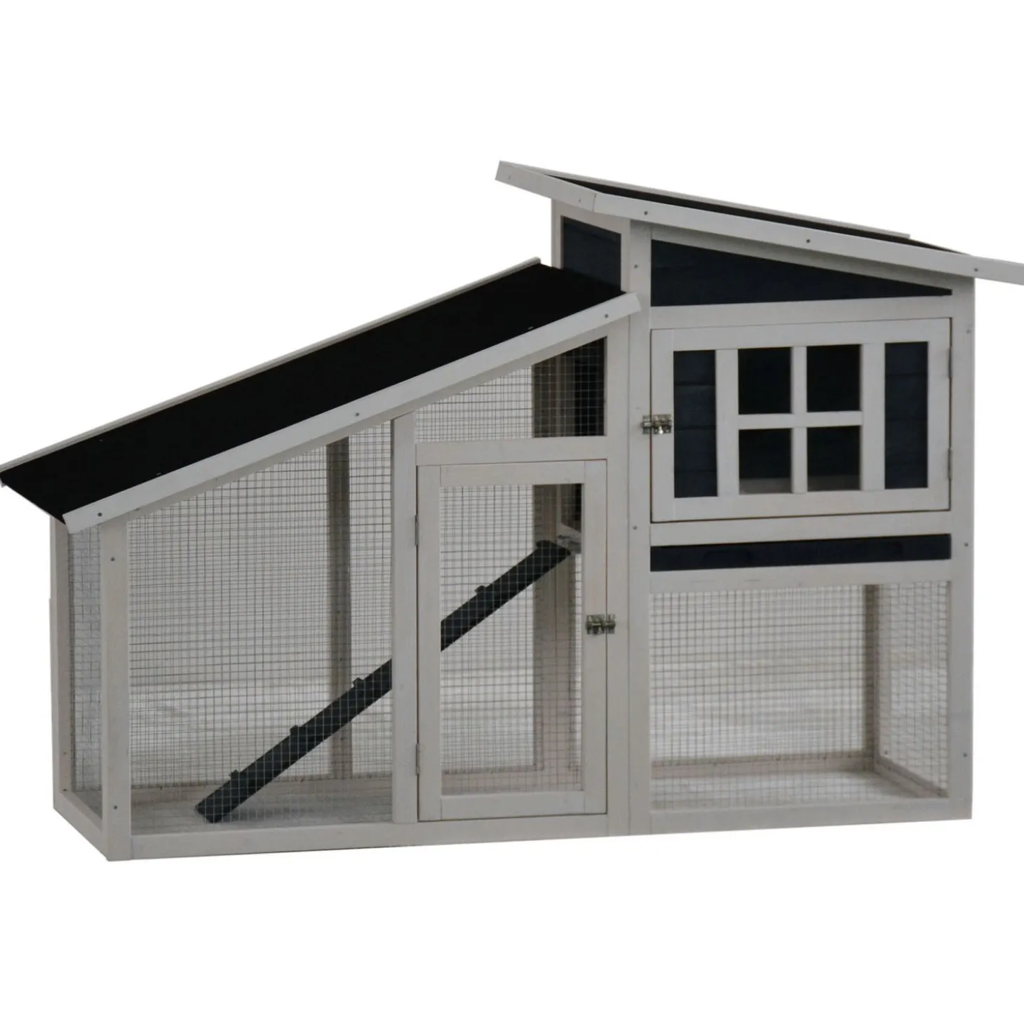 Dit verblijf onderscheidt zich van andere verblijven door het aparte model, waardoor dit hok er leuk uitziet in je tuin. Met een trappetje kunnen je konijnen naar het nachthok. Deze is voorzien van een schuiflade, een openslaand dak en een ruime toegangsdeur, zodat ook het schoonmaken makkelijk wordt gemaakt. Het hok bevat een ruime deur om de konijnen in en uit het hok te tillen en een bitumen dak waardoor je zeker weet dat je konijnen altijd droog zullen zitten.