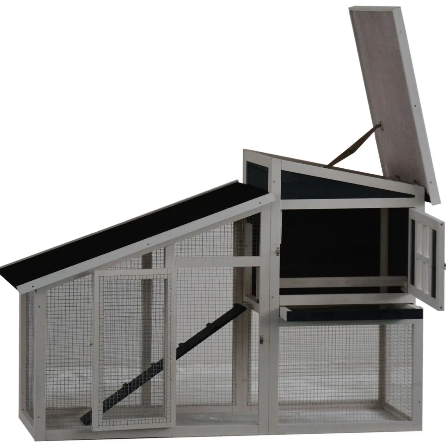 Het Konijnenhok Rome heeft een afmeting van 152 x 60 x 96 cm en is antraciet met wit van kleur.