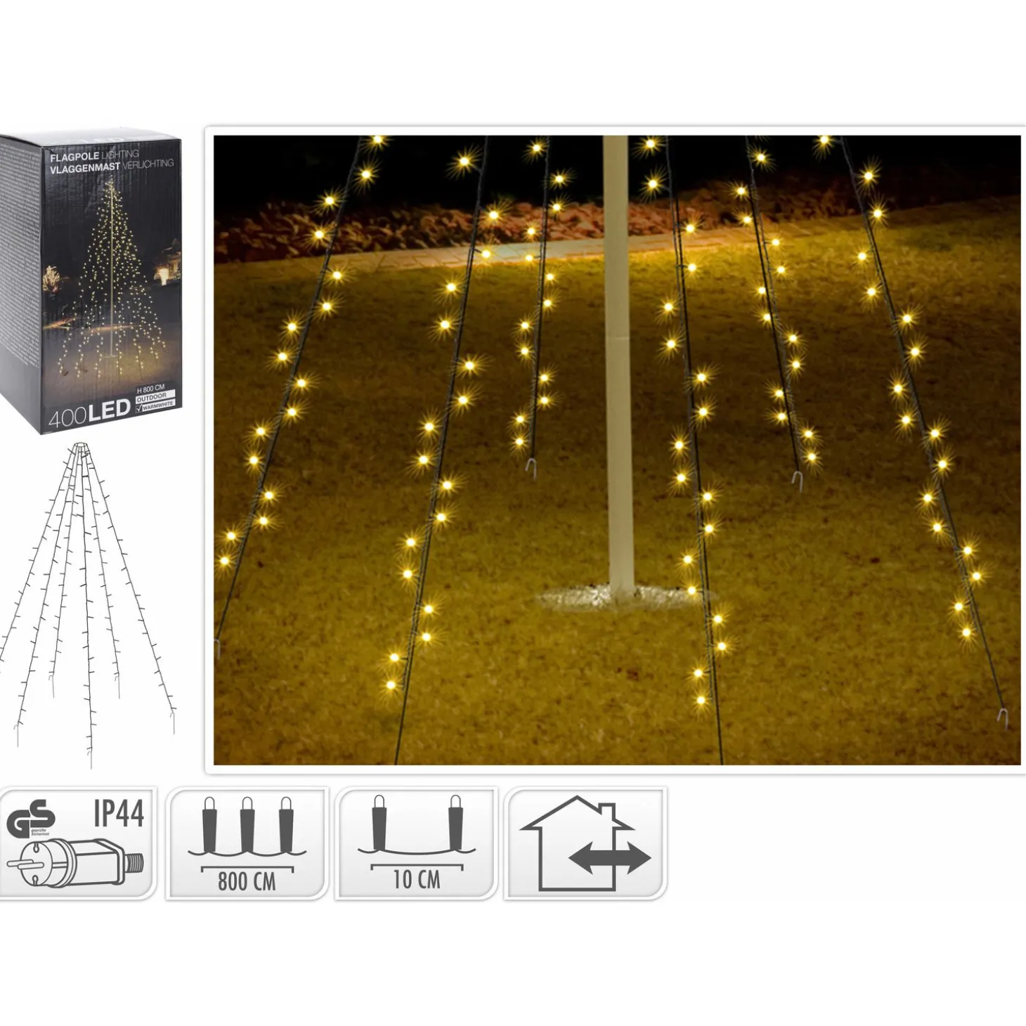 Vlaggenmast – 400 lampjes – 10 strengen van 8 meter – inclusief 10 haringen.
