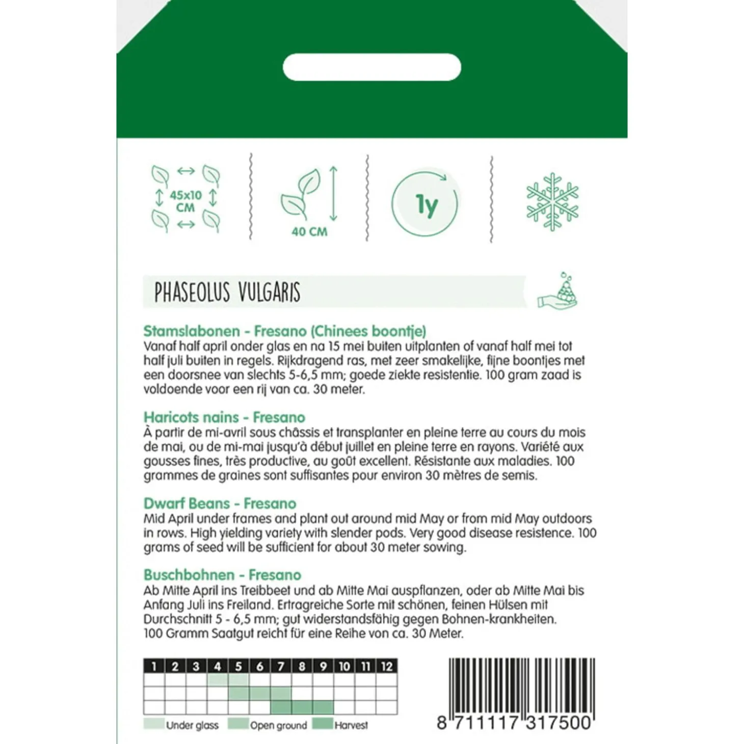 - Geeft ronde, rechte bonen van 10-12cm.