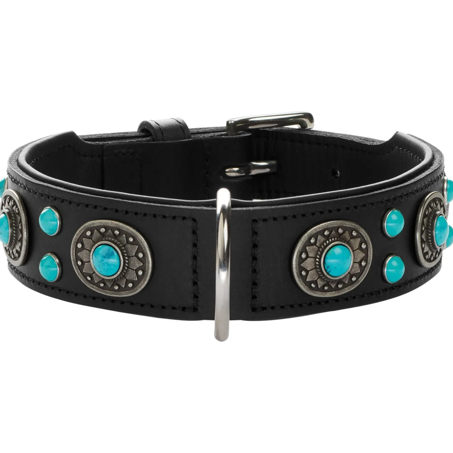 De Halsband Sioux van Hunter is een bijzonder sterke halsband gemaakt van hoogwaardig koeienleer. Enkel de sluitingen, decoratie en het beslag zijn niet van leer gemaakt. De halsband bevat prachtige metalen versieringen en sierstenen voor een elegante look. Geproduceerd in Duitsland.