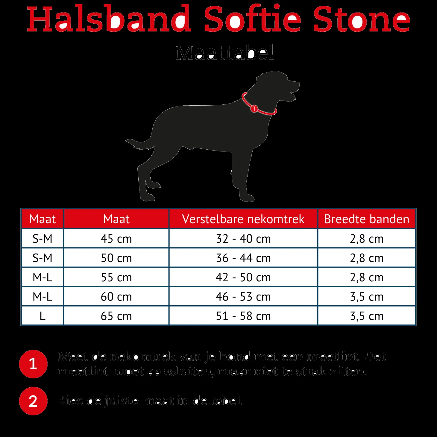 | Aanbeveling | Je meet de juiste omtrek door een flexibel meetlint rond het midden van de nek van je hond te plaatsen. Het meetlint moet goed aansluiten, maar moet niet te strak zitten. Zorg ervoor dat er ongeveer een vingerbreedte tussen het meetlint en de nek zit. Kies vervolgens een passende nekomtrek. Valt de omtrek net aan het eind van een maat? Kies dan voor de zekerheid een maatje groter (al helemaal voor honden in de groei). De afmetingen waar je uit kunt kiezen hebben betrekking op de totale lengte van het product, waarbij geen rekening wordt gehouden met de gesp of sluiting. Zie onderstaande tabel voor de kleinste en grootste waarden waarop de halsband versteld kan worden! |