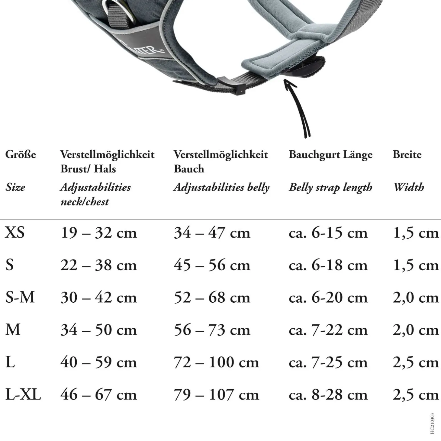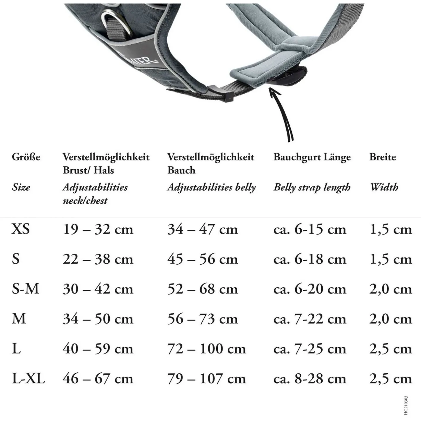 | XS | 19 – 32 cm | 34 – 47 cm | 1,5 cm |