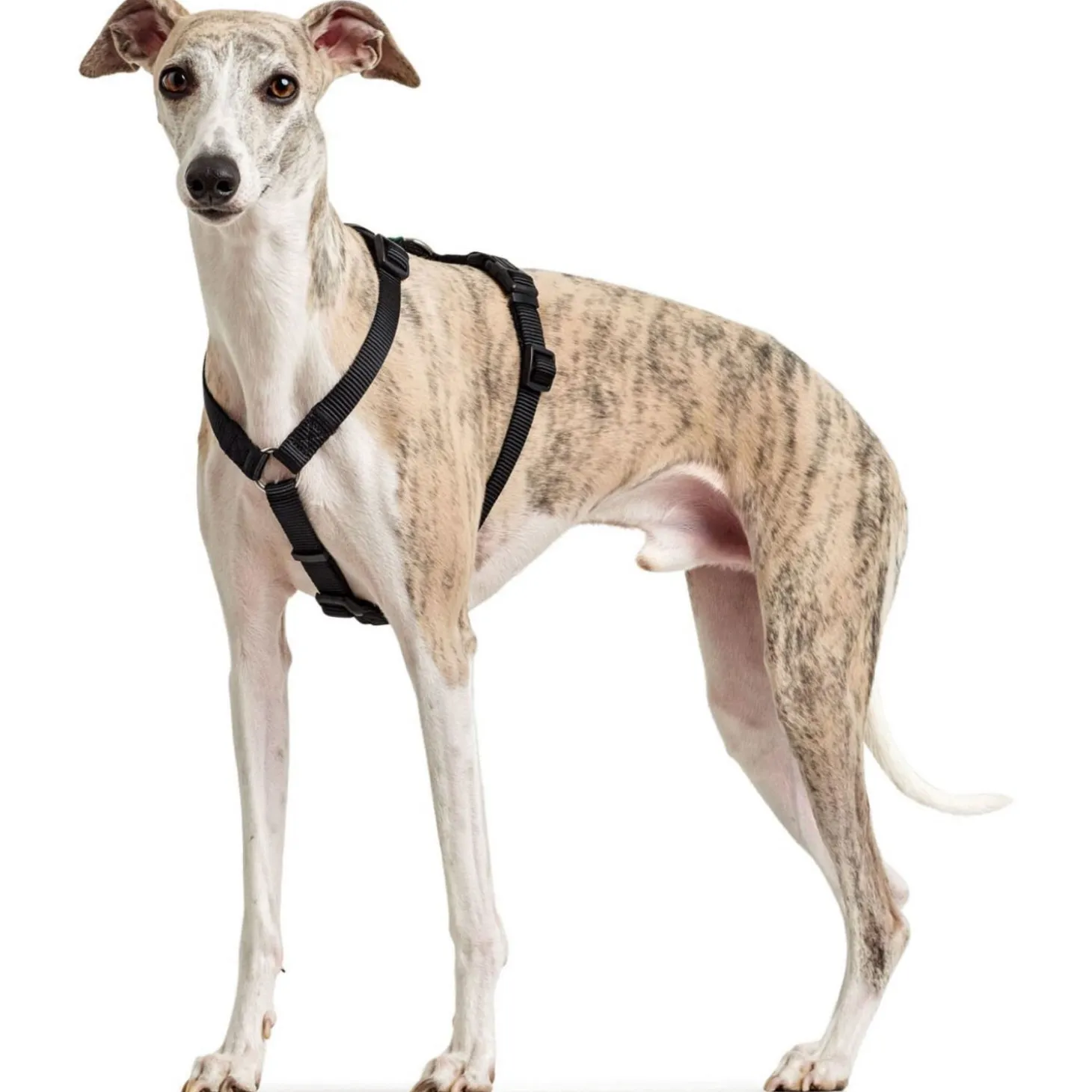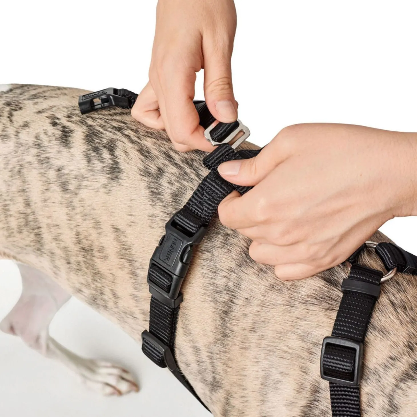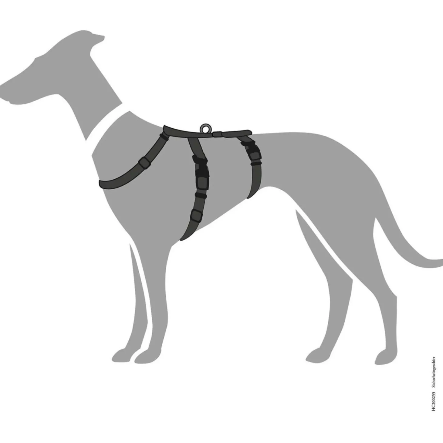 Het tuig kan op meerdere punten versteld worden. De looplijn of riem bevestig je aan de D-ring op de rug.