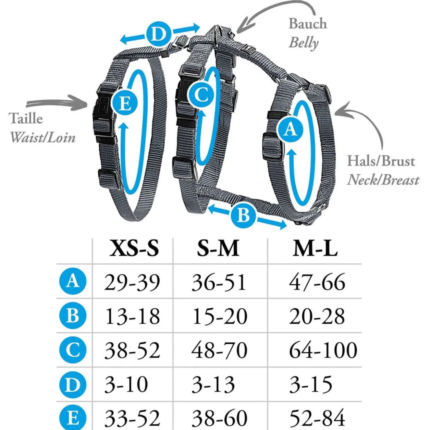 | M-L: | 47 – 66 cm | 64 – 100 cm | 52 – 84 cm | 2,5 cm |