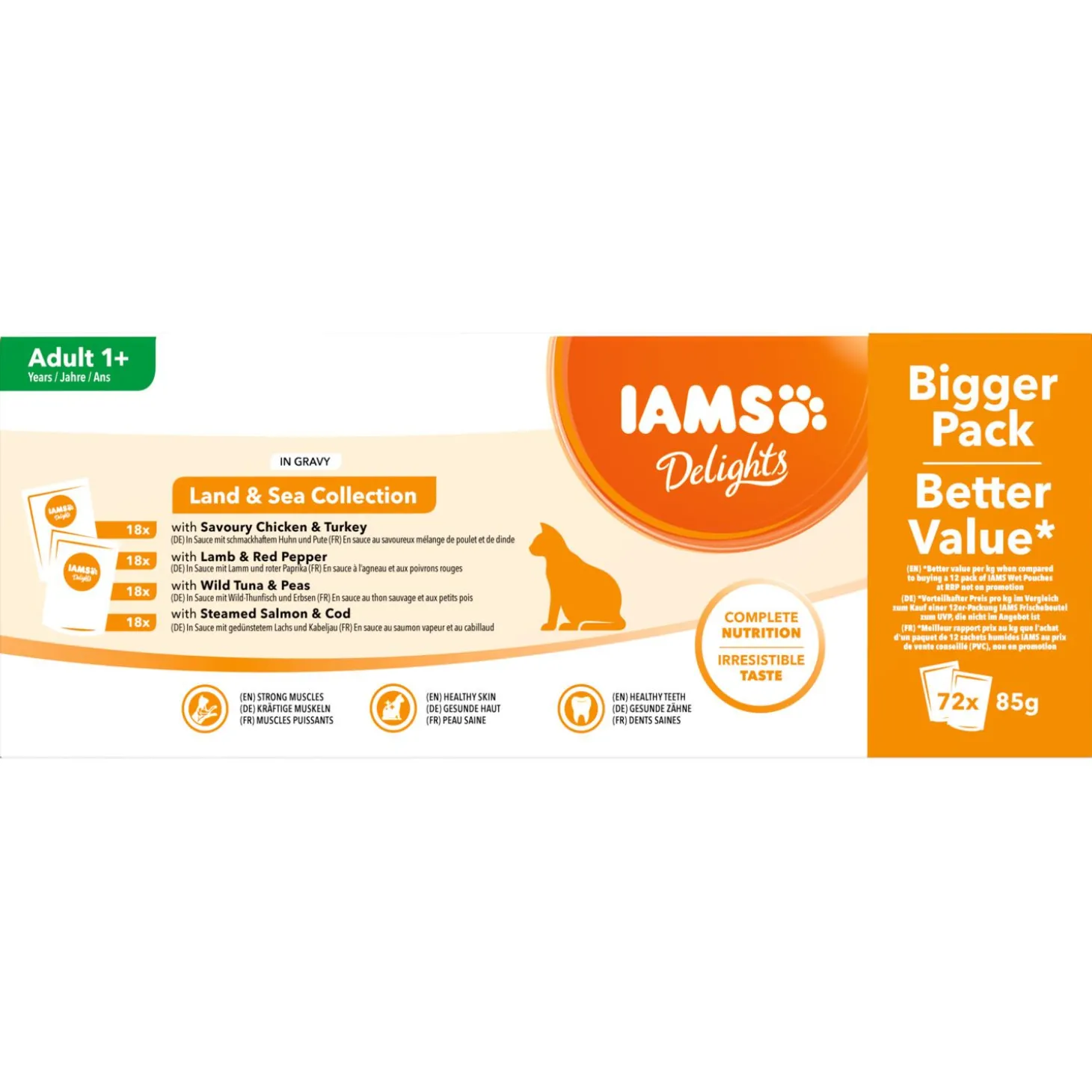 - Land & Sea Collection in Gravy met vier smakelijke varianten: Hartige kip en kalkoen, Lam met rode peper, Wilde tonijn met erwten en Gestoomde zalm met kabeljauw