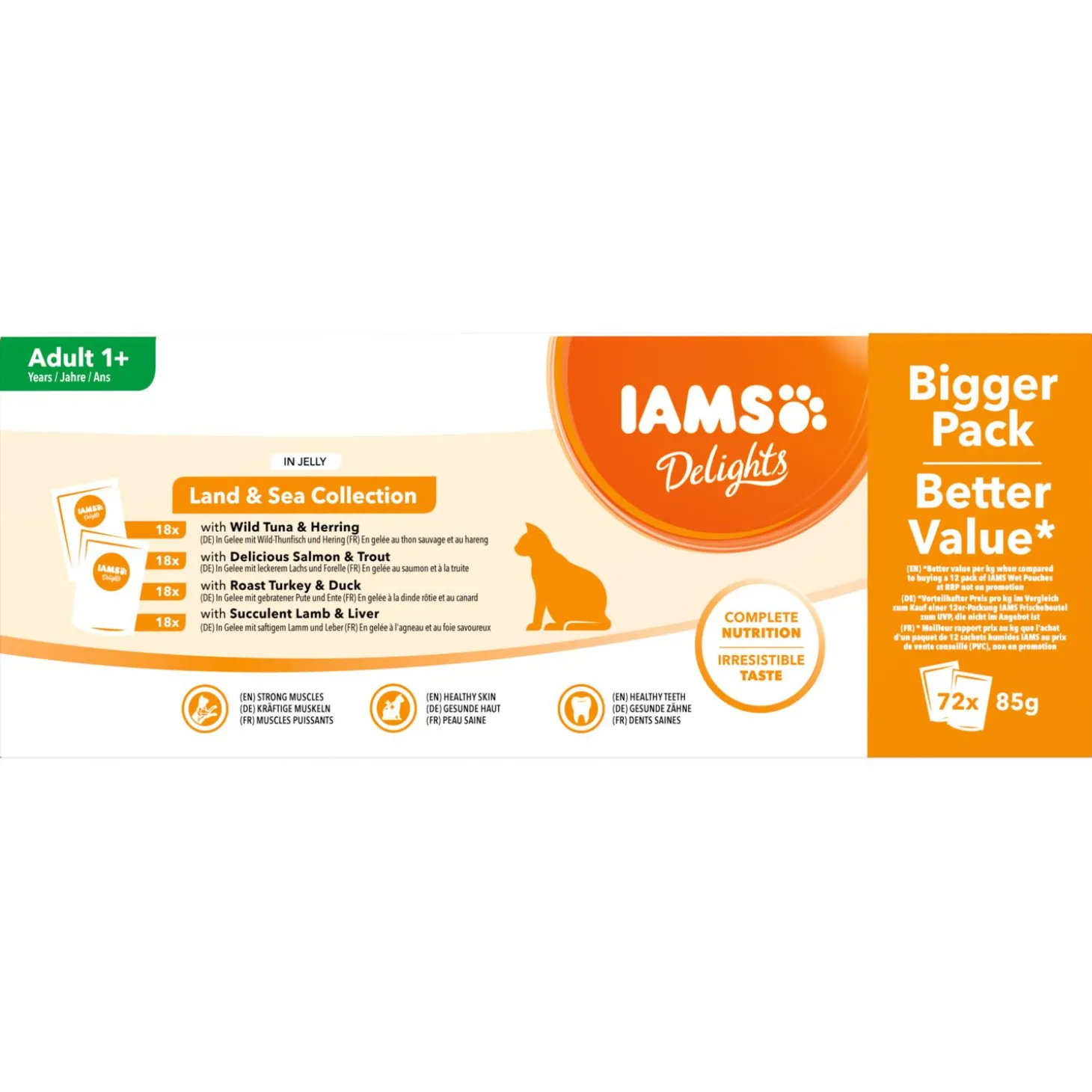 - De Land & Sea Collection in Jelly bevat vier smakelijke varianten die uw kat heerlijk zal vinden: wilde tonijn met haring, heerlijke zalm met forel, geroosterde kalkoen met eend, en mals lam met lever.