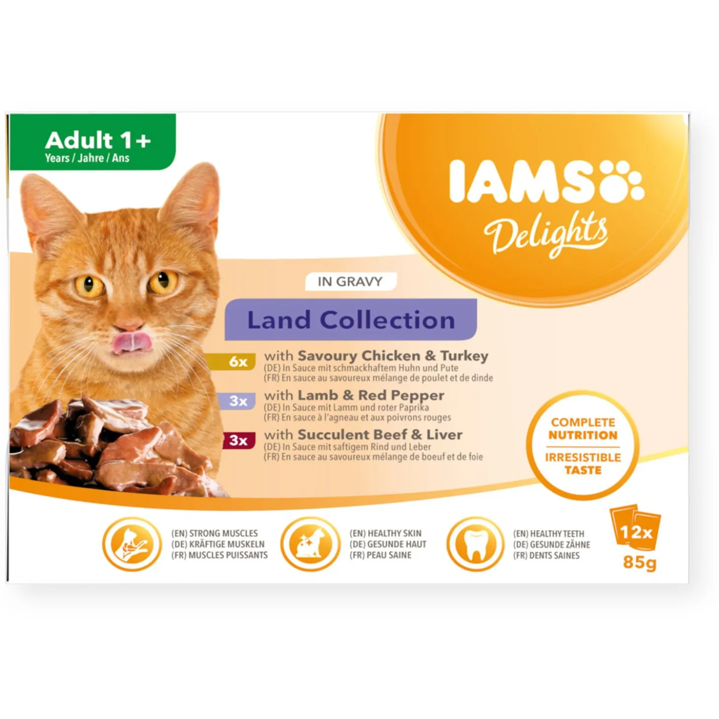 IAMS Delights Land Collection in Saus bevat alle voedingsstoffen die uw volwassen kat nodig heeft om gezond en fit te blijven. - Onweerstaanbare smaak: