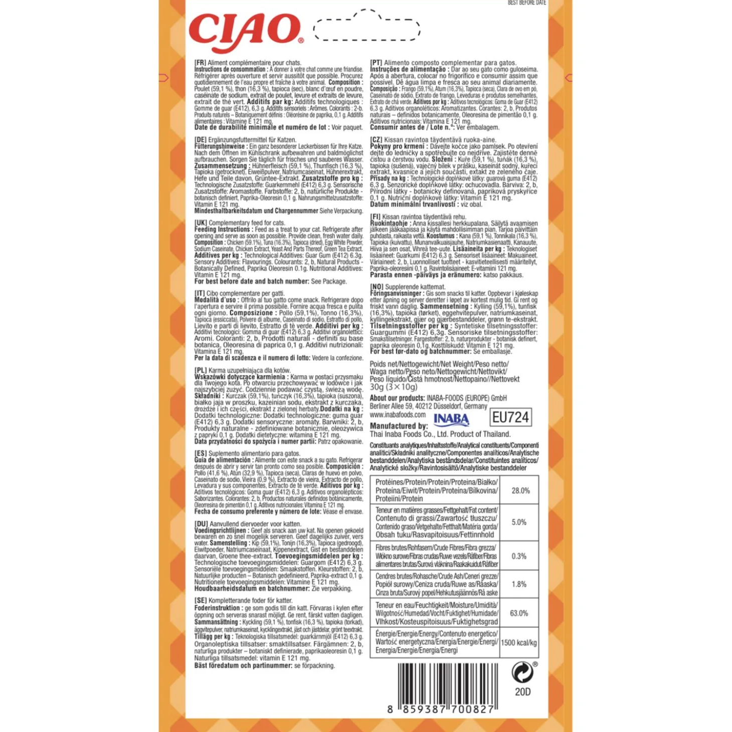 | Samenstelling | Kip (59,1%), Tonijn (16,3%), Tapioca (gedroogd), Eiwitpoeder, Natriumcaseïnaat, Kippenextract, Gist en bestanddelen daarvan, Groene thee-extract. |