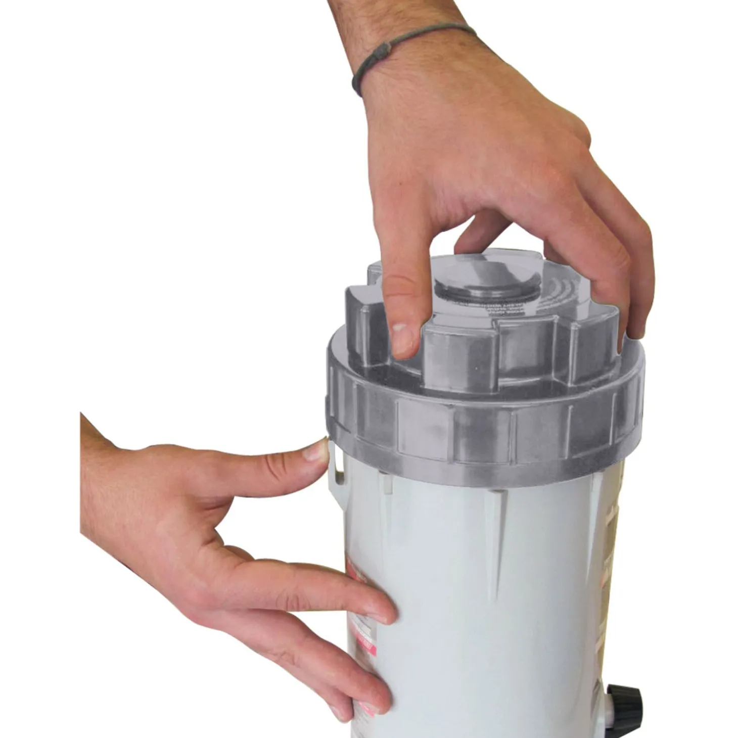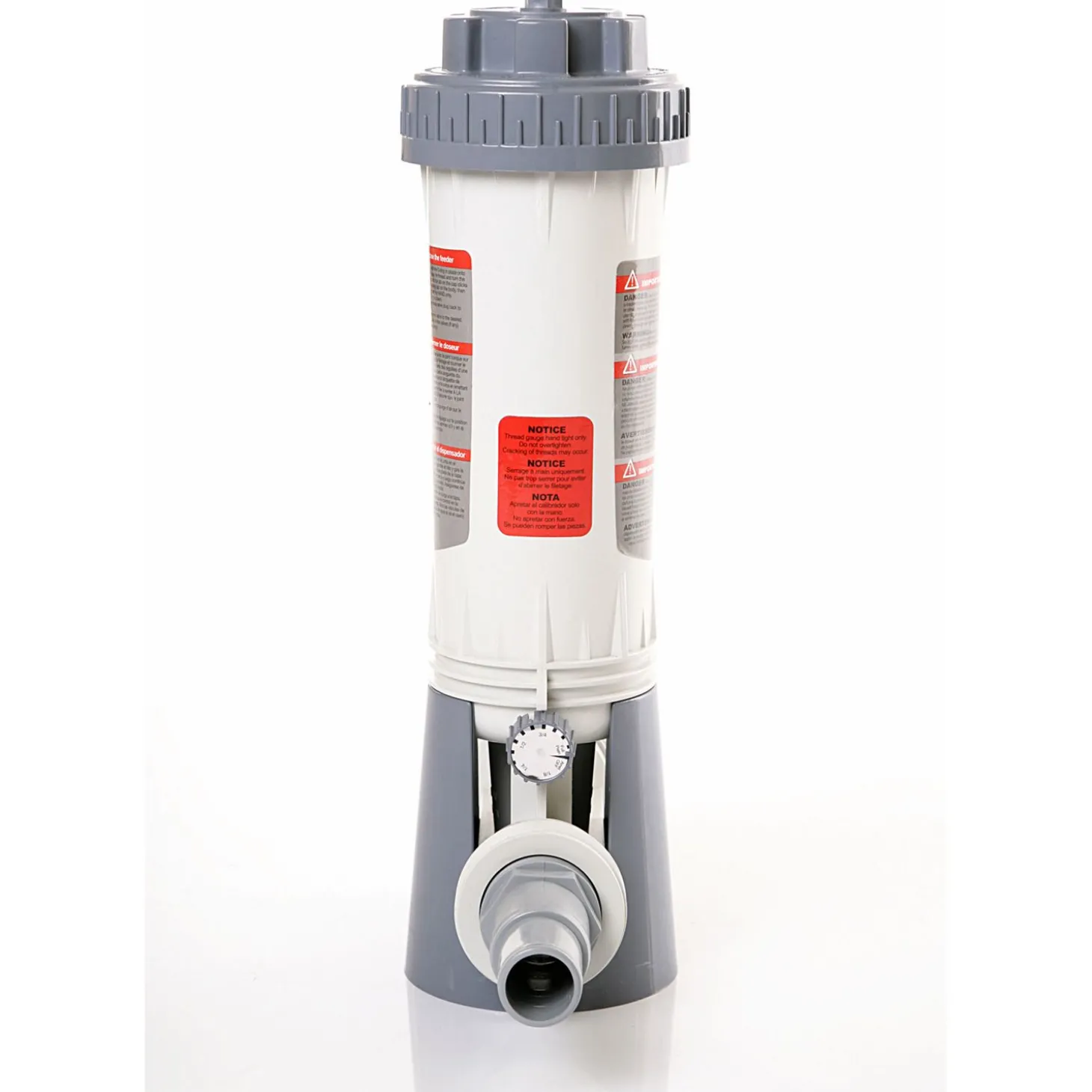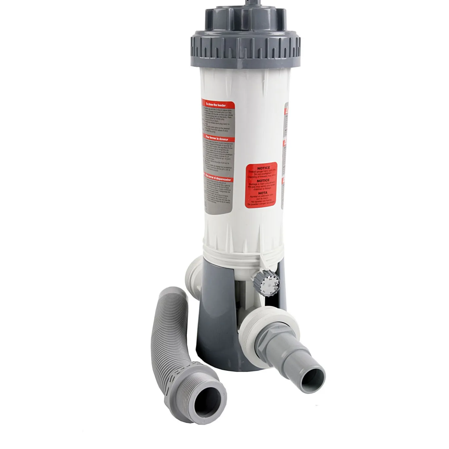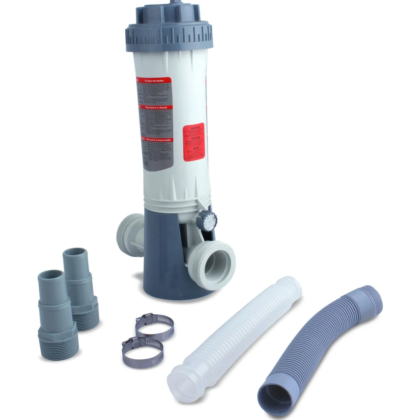 De automatische chloor dispenser is makkelijk aan te sluiten. Je plaatst deze tussen de filterpomp en de retourslang naar het zwembad. De chloor dispenser is geschikt voor zwembaden en filterpompen met een slang met een aansluiting van 32 mm. De automatische chloor dispenser heeft een capaciteit van 9 tabletten (met een diameter van 7,62 cm) of 1,9 kg kleine tabletten.