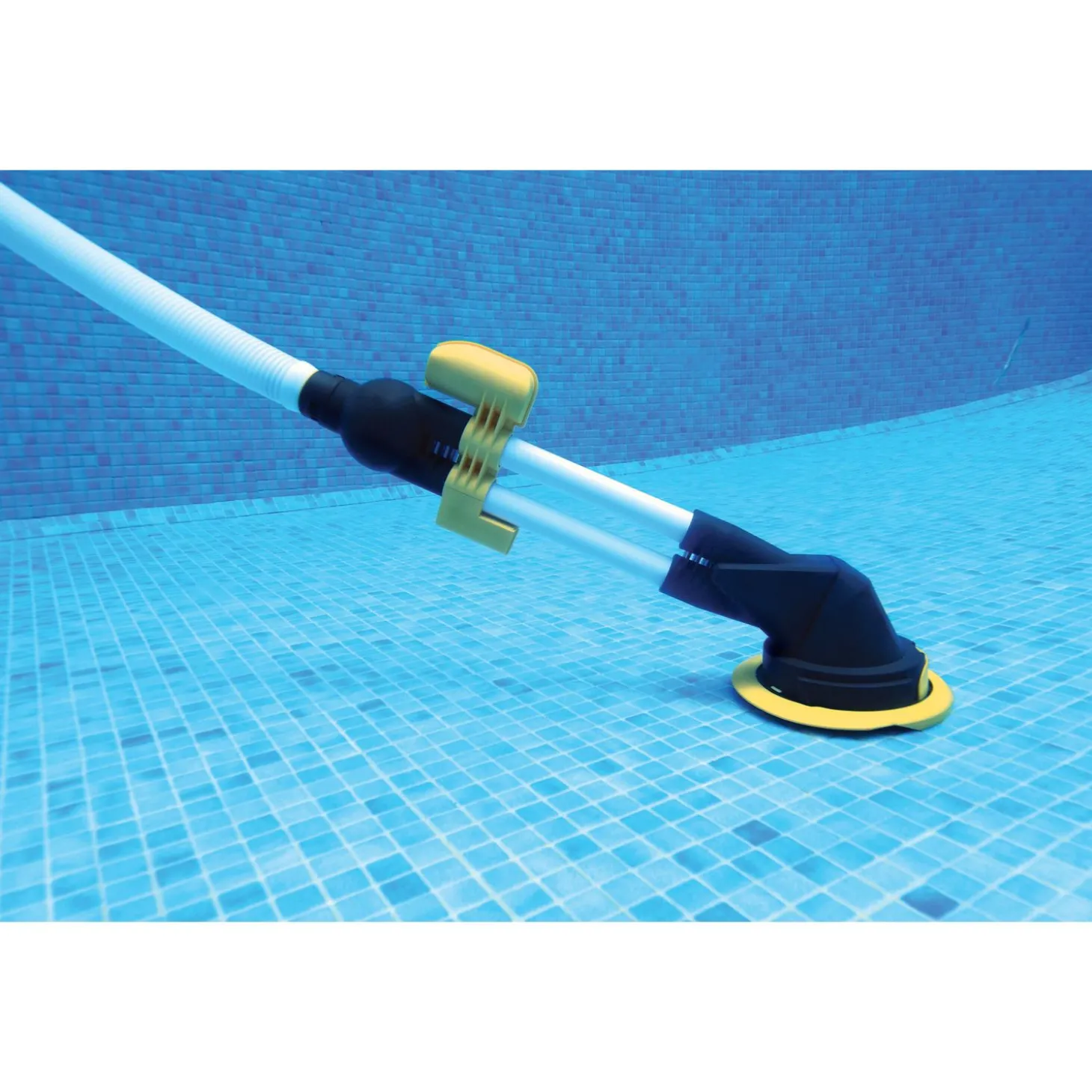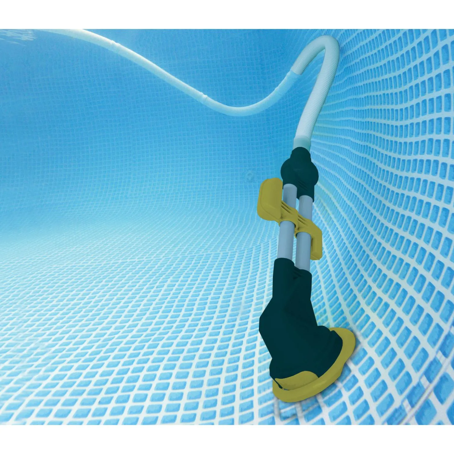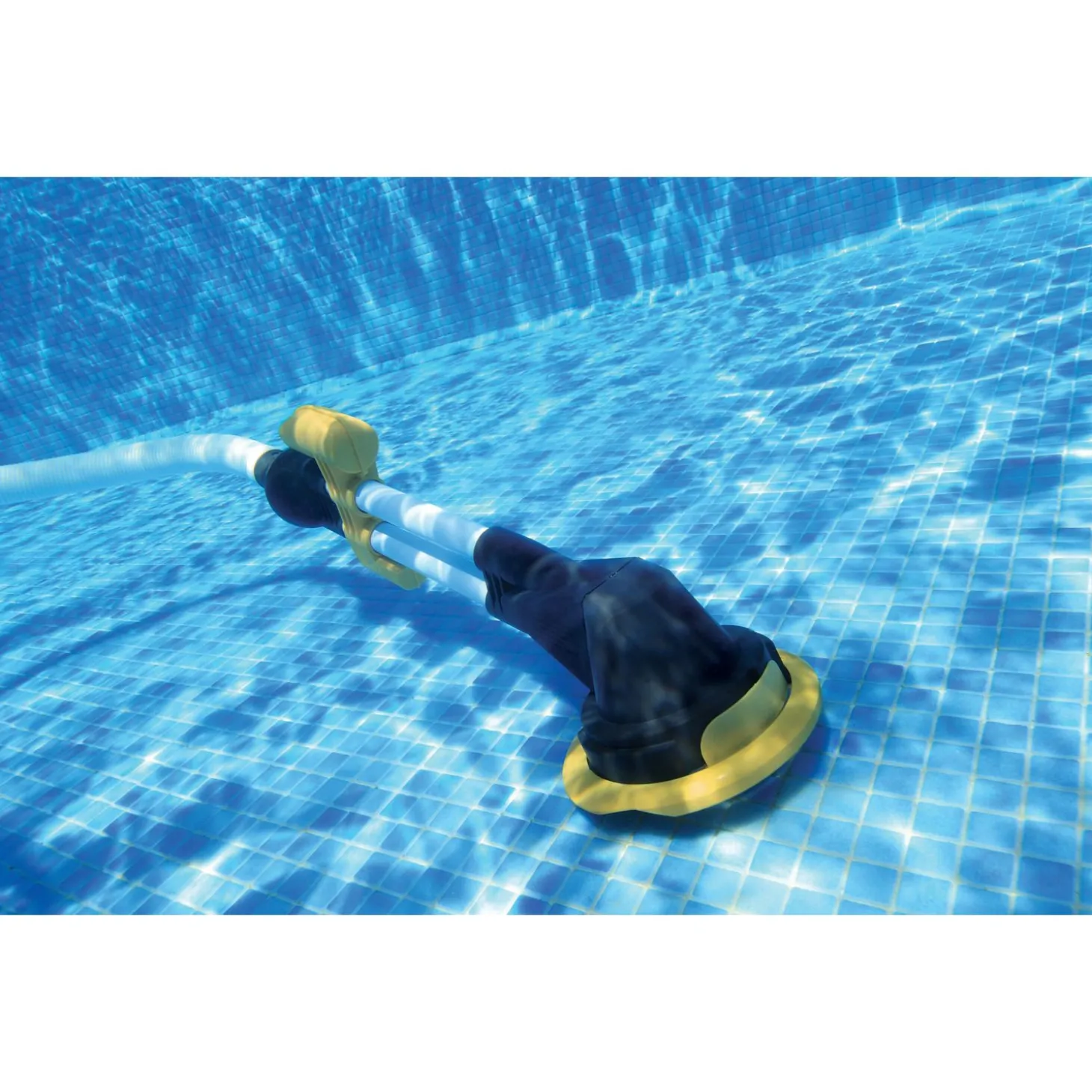 De zwembadreiniger is zwart met geel.
