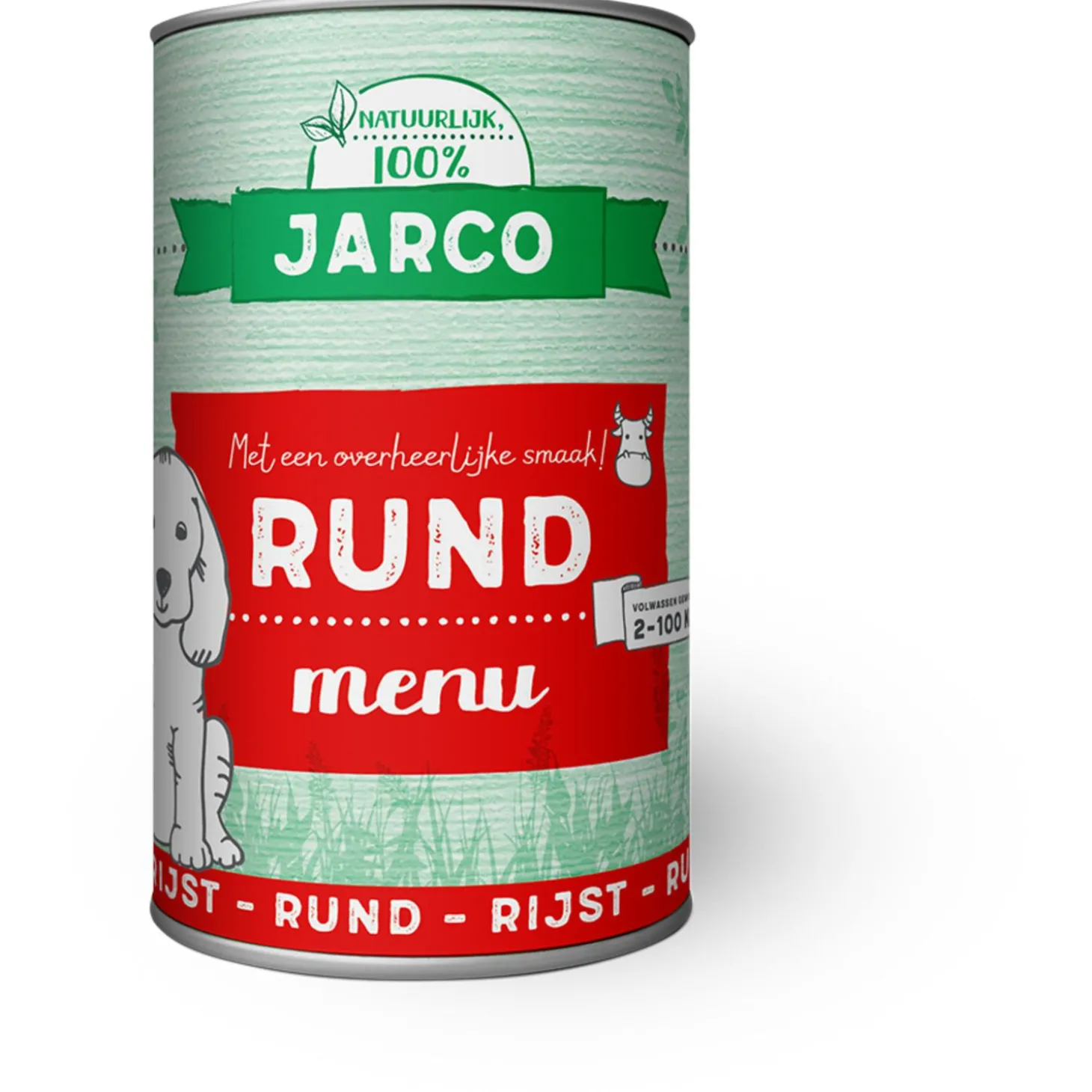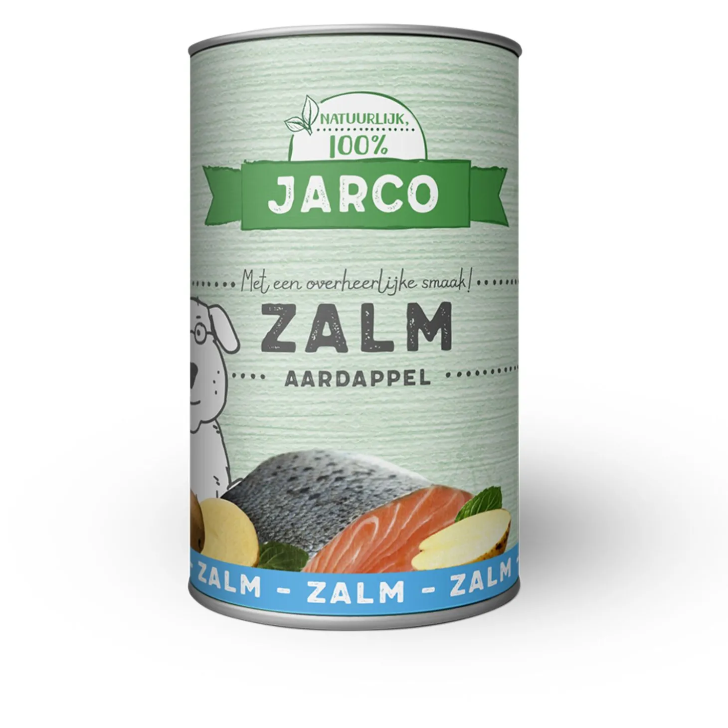 Dog Blikvoeding van Jarco is verkrijgbaar in 6 smaken met een inhoud van 400g.
