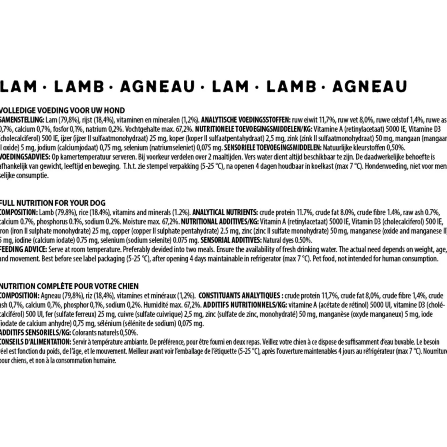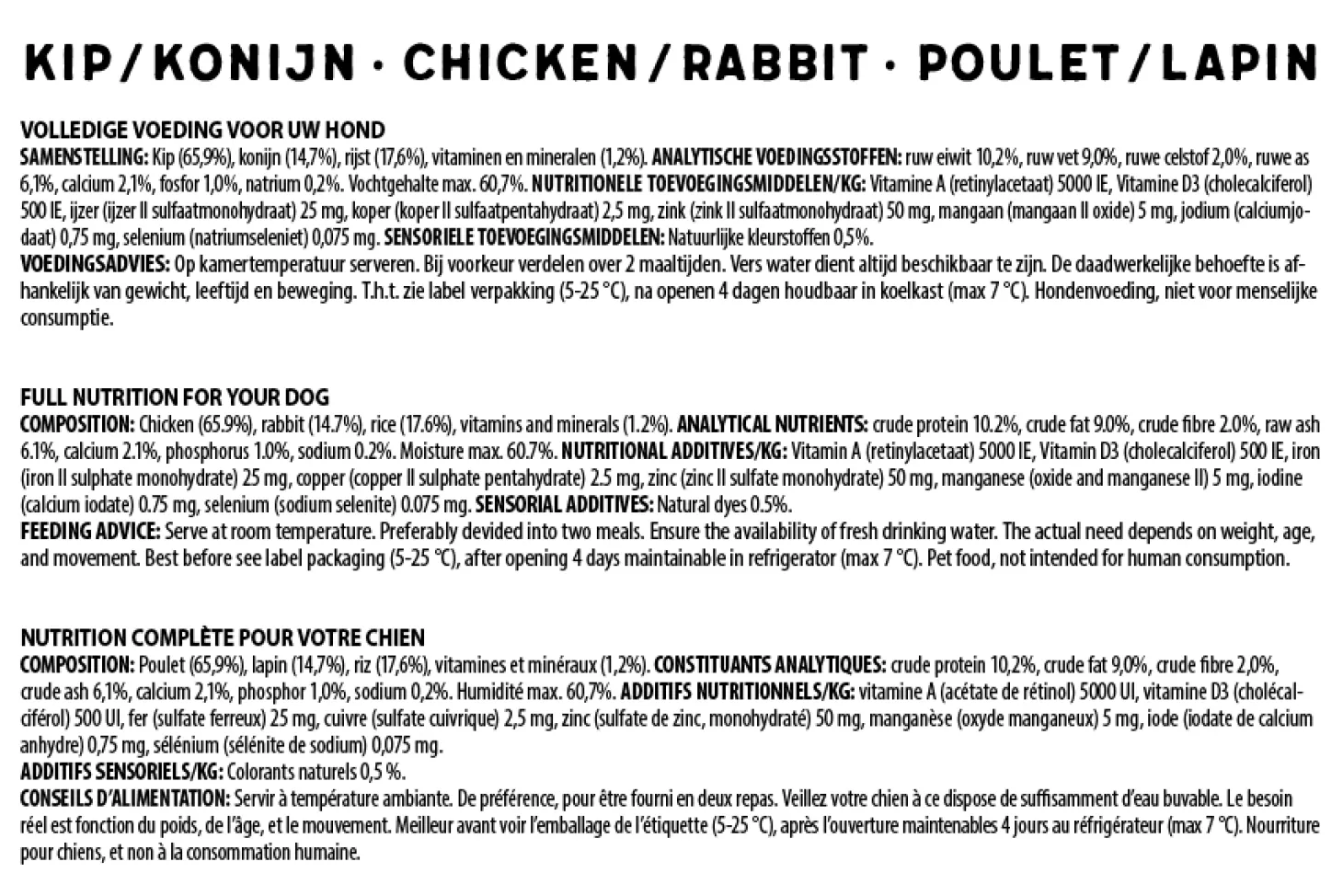 | Aanbeveling | Op kamertemperatuur serveren. Bij voorkeur verdelen over 2 maaltijden. Vers water dient altijd beschikbaar te zijn. De daadwerkelijke behoefte is afhankelijk van gewicht, leeftijd en beweging. Hondenvoeding, niet voor menselijke consumptie. |