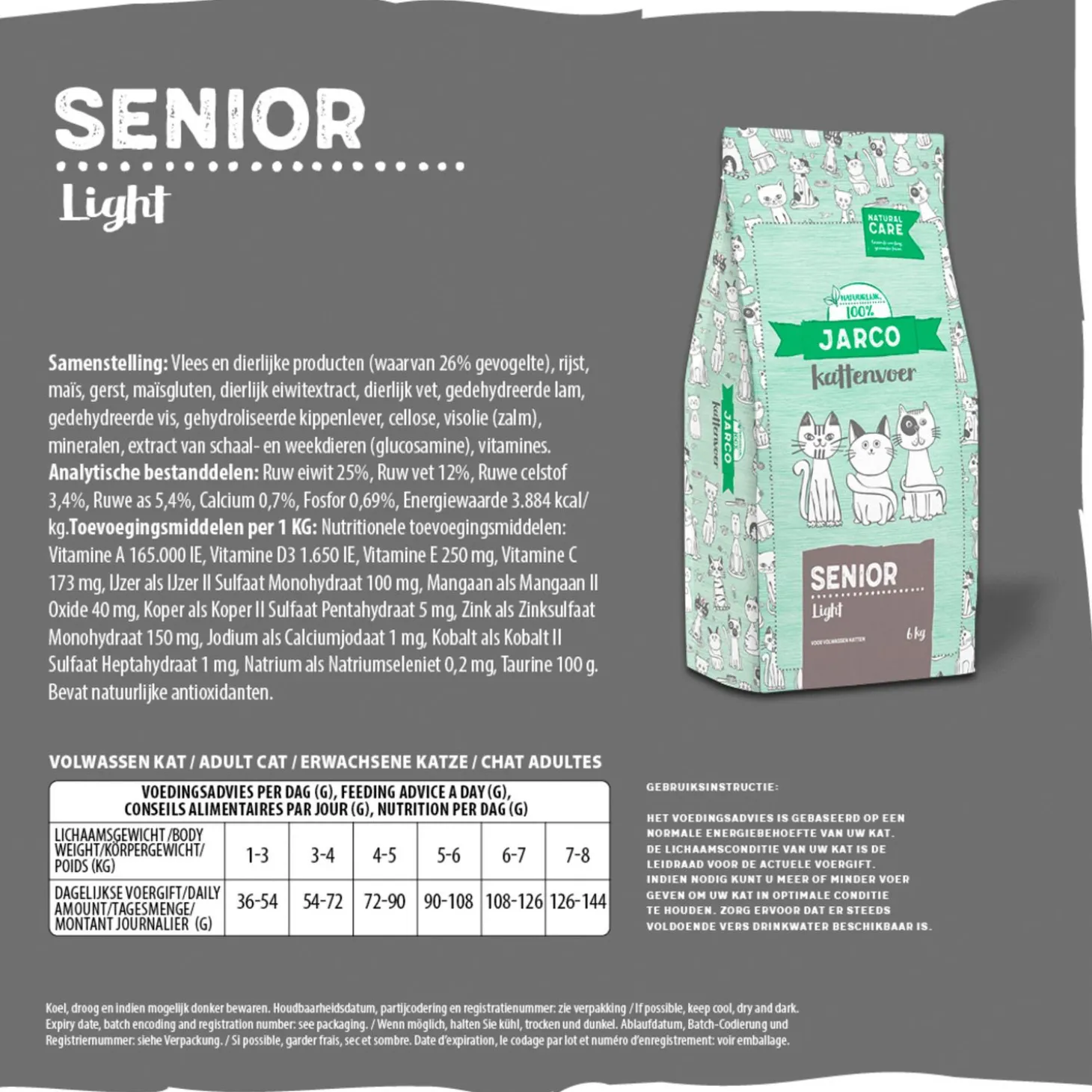 | Analyse | Ruw eiwit 25%, Ruw vet 12%, Ruwe celstof 3,4%, Ruwe as 5,4%, Calcium 0,7%, Fosfor 0,69%, Energiewaarde 3.884 kcal/kg. |