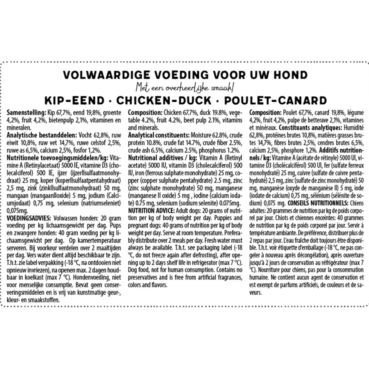 | Samenstelling | Kip 67,7%, eend 19,8%, groente 4,2%, fruit 4,2%, bietenpulp 2,1%, vitaminen en mineralen. |