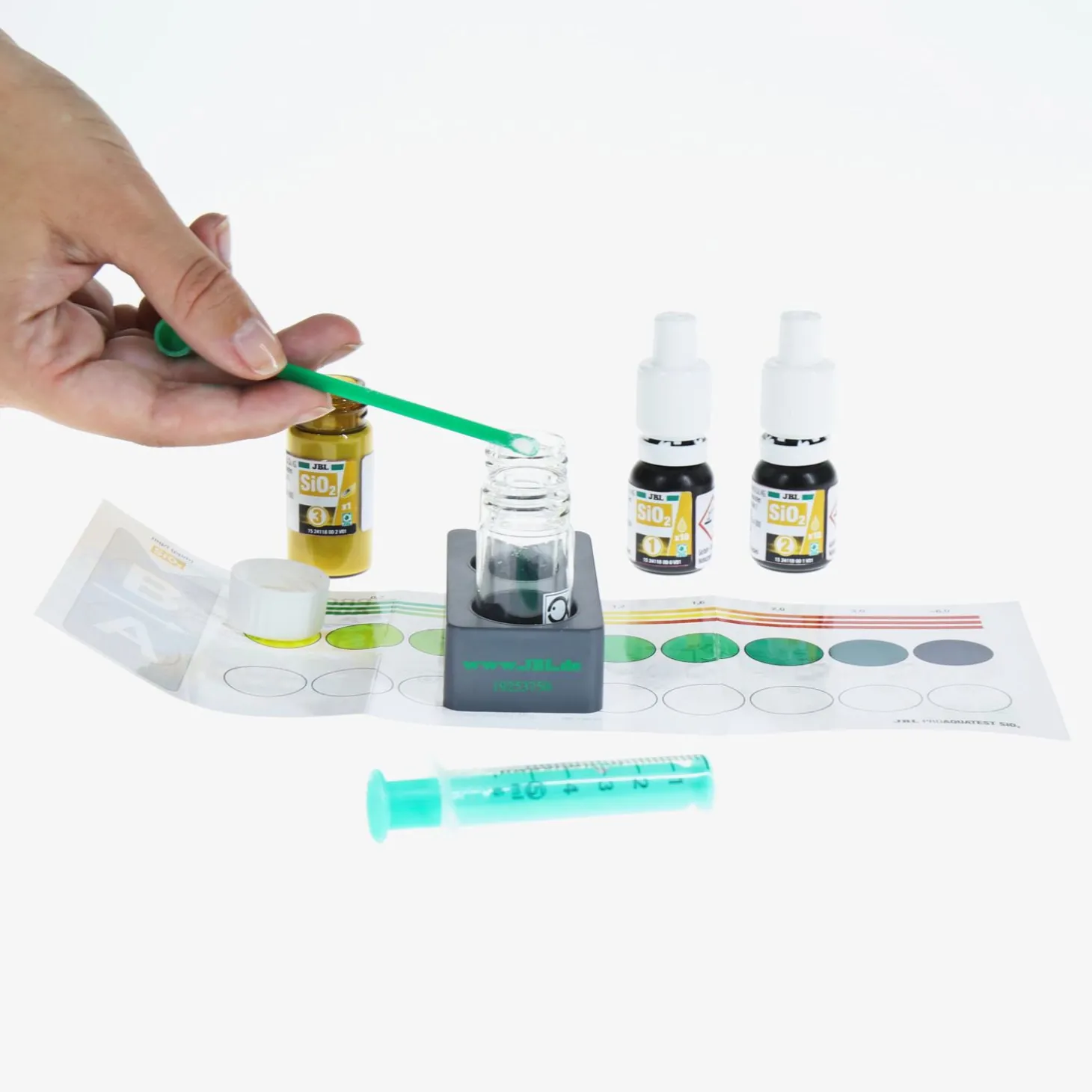 - Incl. 2 reagentia, 2 glazen cuvetten met schroefdop, doseerlepel, spuit, comparatorblok en kleurenscala