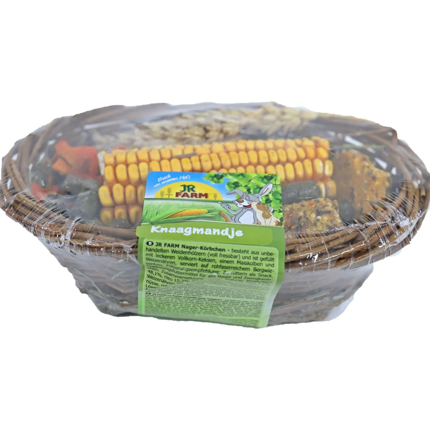 Elk huisdier verdient om af en toe een lekkere beloning te krijgen. Maar naast lekker, moet een tussendoortje natuurlijk ook gezond zijn! Het Knaagmandje van JR Farm is een lekker én gezond tussendoortje bestaande uit een mandje van (volledig eetbaar) onbehandeld wilgenhout met daarin heerlijke volkorenkoekjes, maïs en korenaren. Dit alles geserveerd op vezelrijk bergweidehooi.