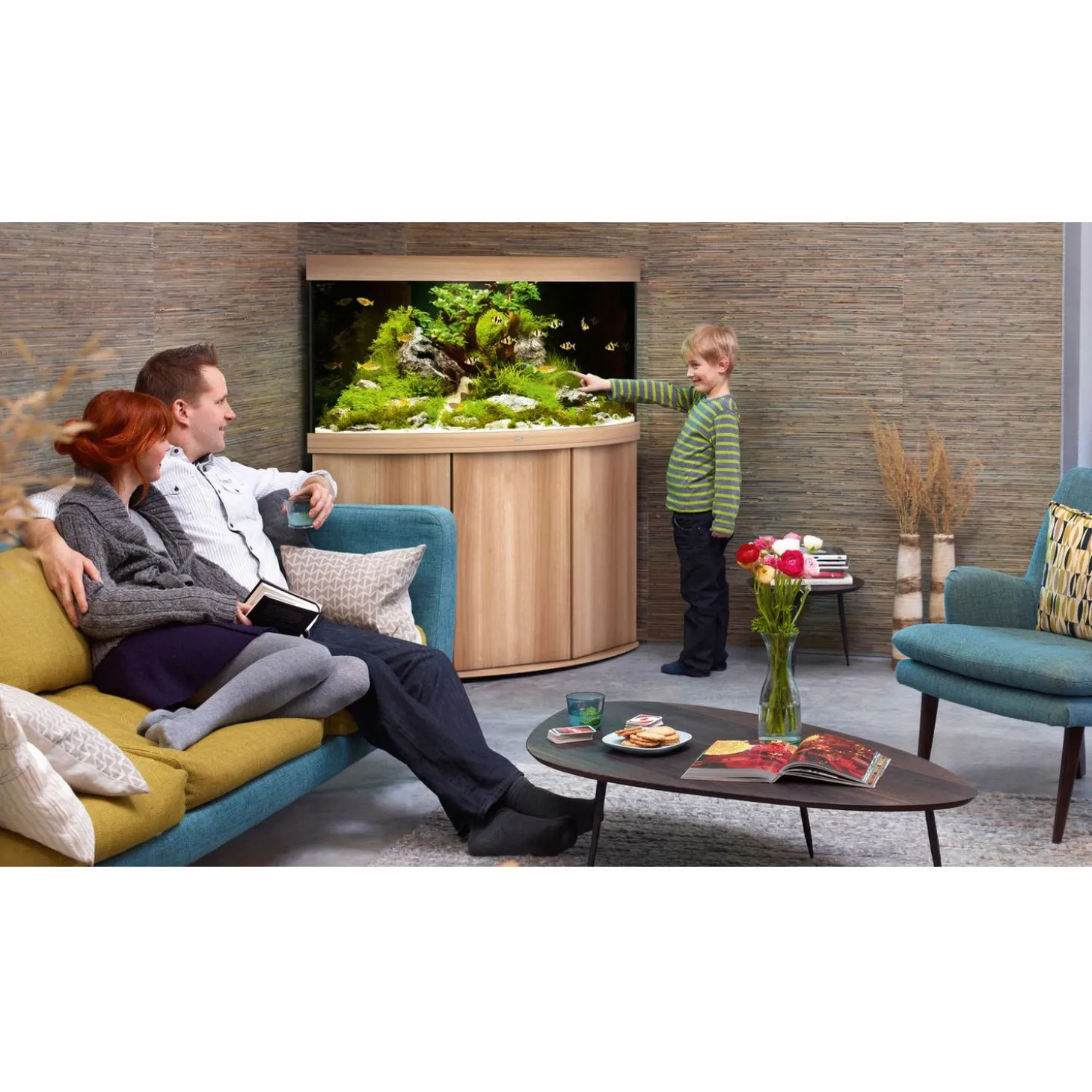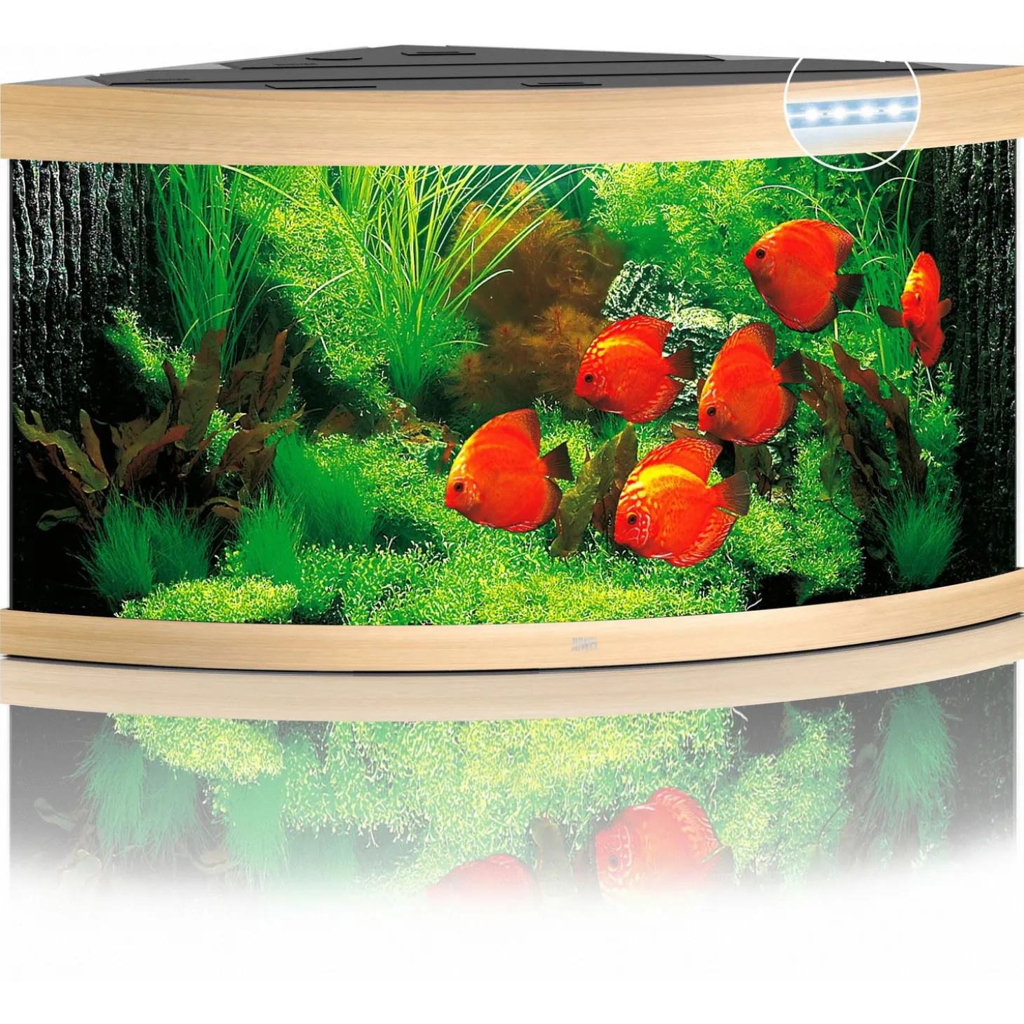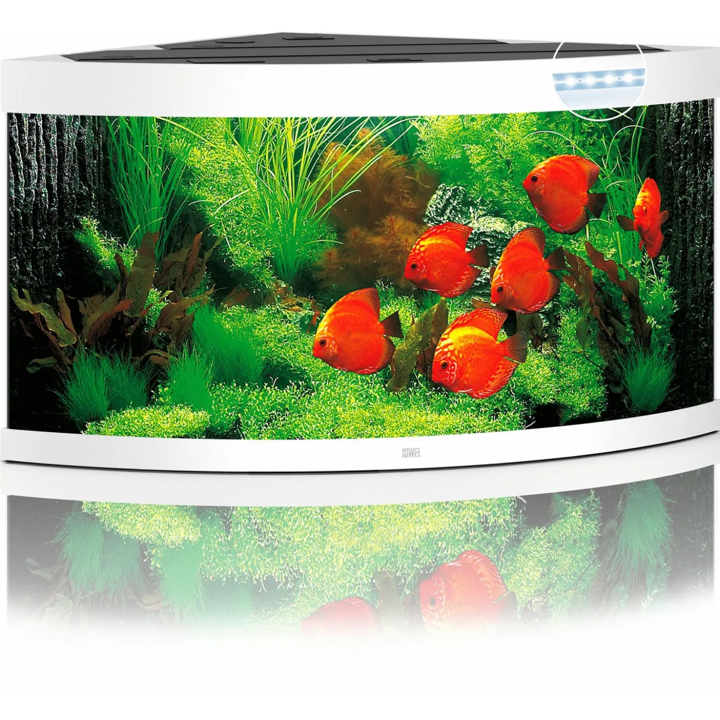 Het TRIGON 350-aquarium schittert in elke hoek met zijn unieke diepte van 87 cm en zijn gebogen voorruit en wordt optimaal verlicht door vier LED-buizen.