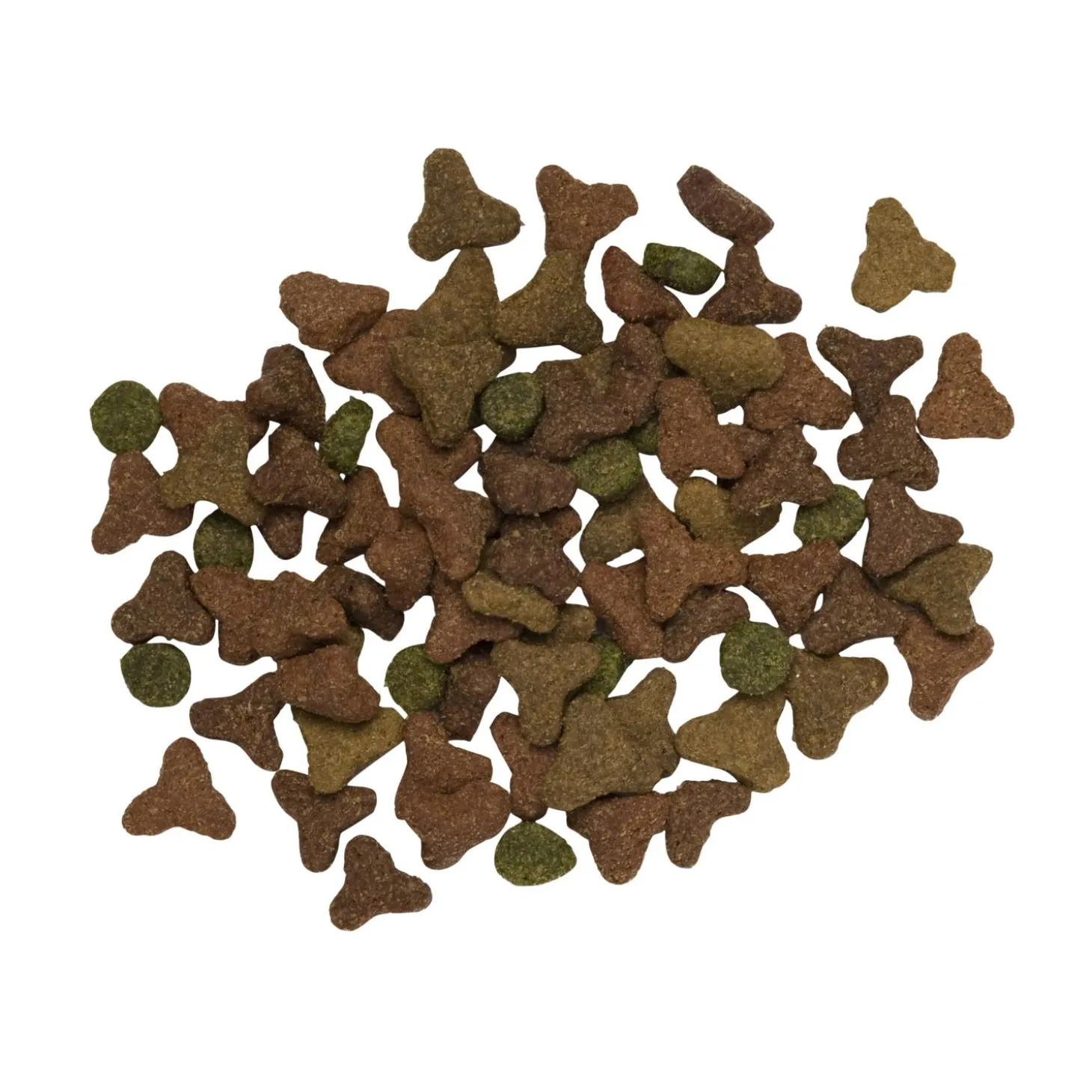 | Samenstelling | Gewicht: 3 kg. Smaak: Mix. Samenstelling:Granen, vlees en dierlijkebijproducten (min. 4% kipen min. 4% rund), plantaardige bijproducten,oliën en vetten, vis envisbijproducten (min. 0,5%vis), mineralen en gist. |