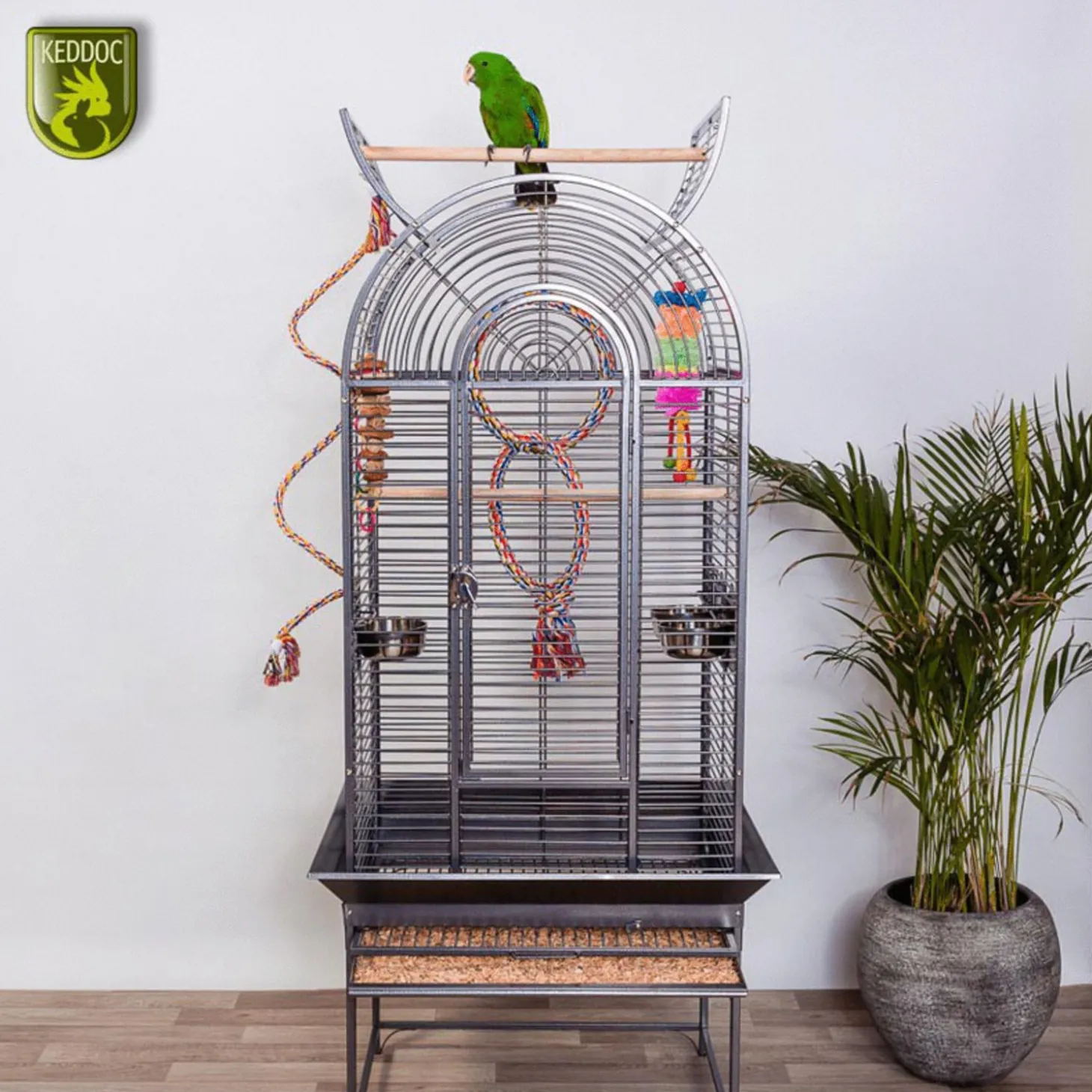 Deze prachtige vogelkooi is geschikt voor zowel parkieten als papegaaien. Een extra voordeel van deze kooi is het open dak, waar je een zitstok aan kunt bevestigen voor meer bewegingsruimte voor je vogel. Grote parkieten en papegaaien zijn dol op klimmen, daarom heeft deze kooi zowel horizontale als verticale tralies. Dankzij de combinatie van horizontale en verticale tralies, samen met de stevige dikke stalen tralies, is deze kooi bijzonder robuust.
