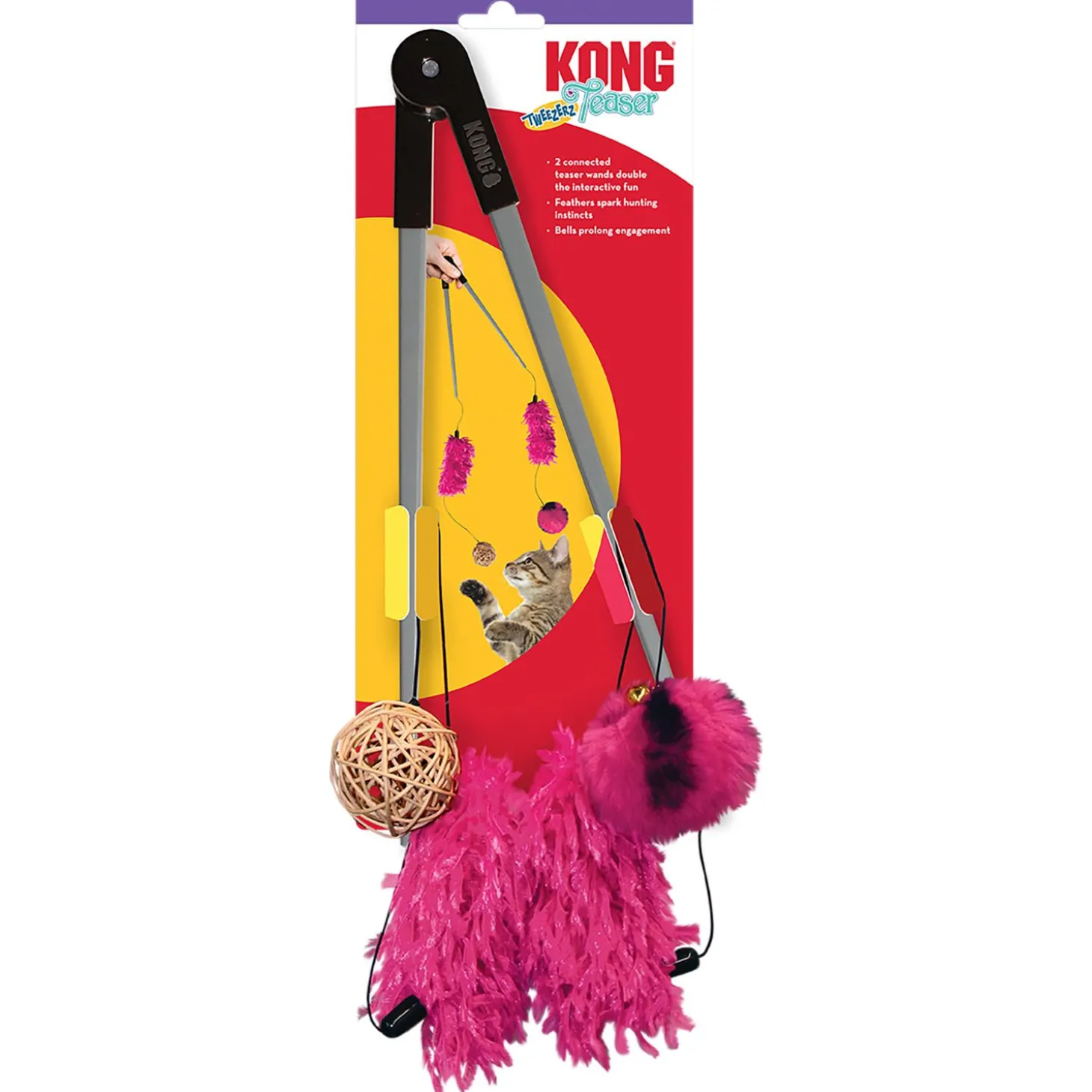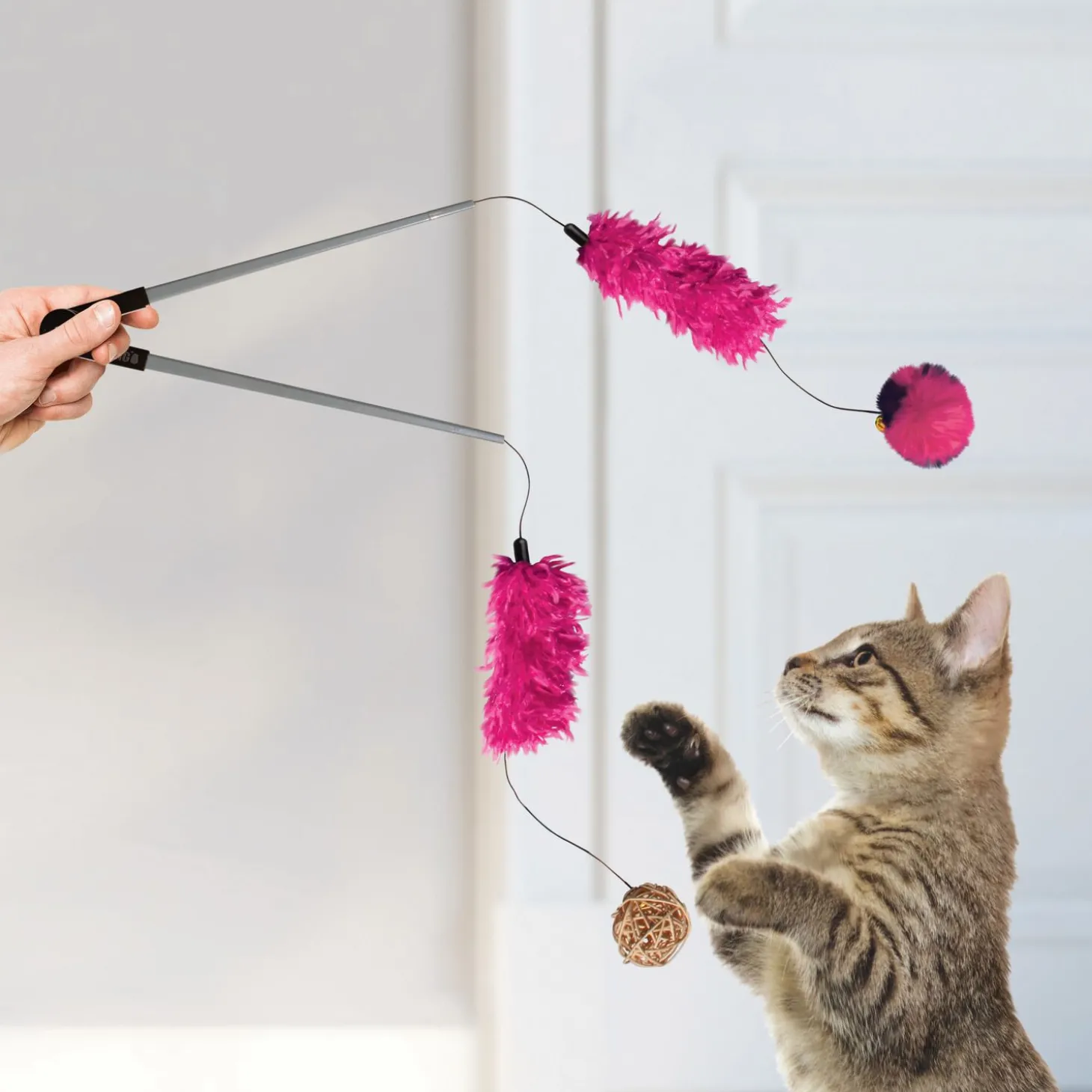 - 2 verbonden teaserstokken verdubbelen het interactieve plezier