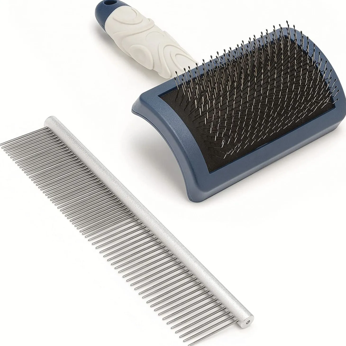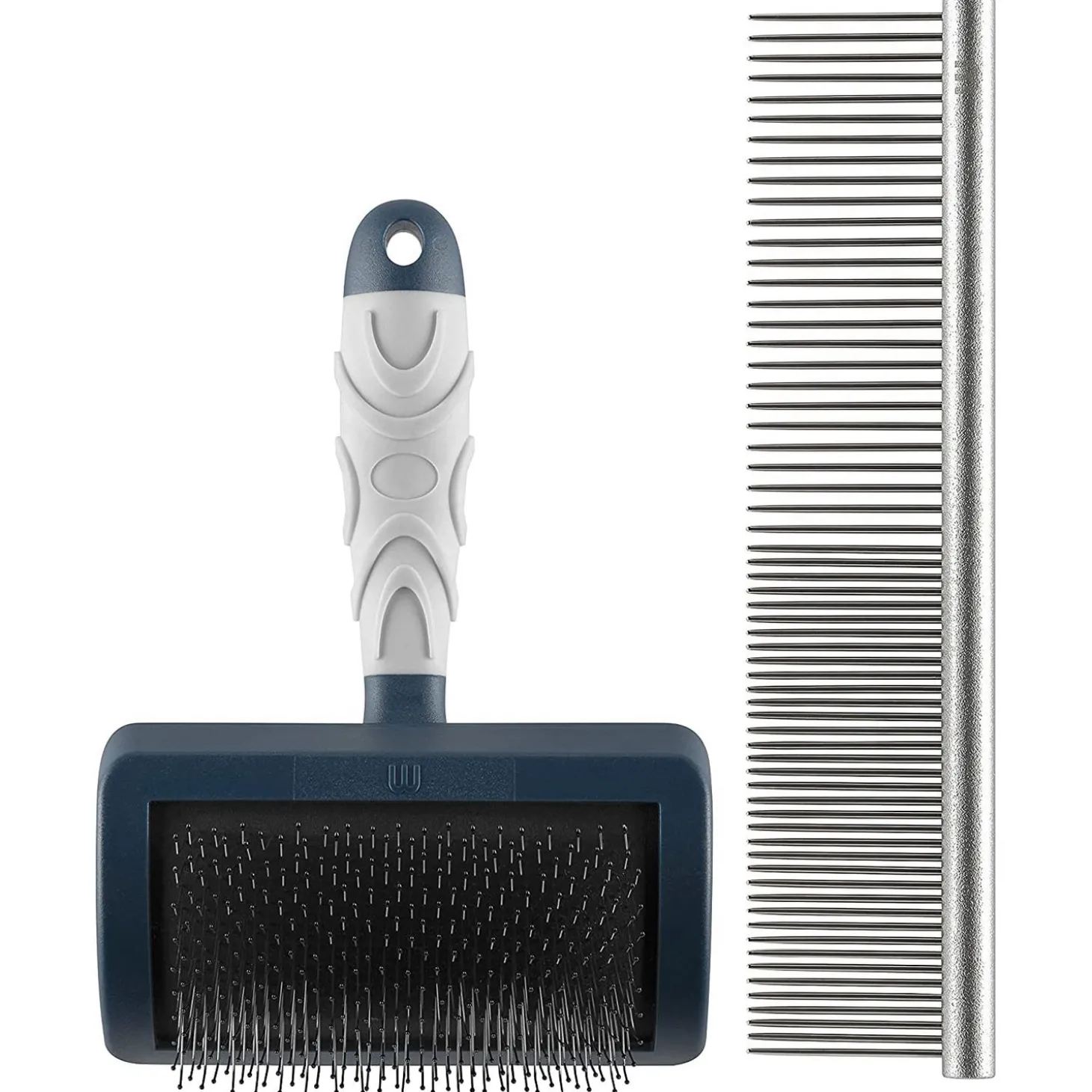 Met de Slicker van Mikki kan je gemakkelijk losse en dode haren in de vacht van je hond verwijderen. De pinnen van de borstel zijn stevig zodat ook de onderste lagen van de vacht gemakkelijk te bereiken zijn. Wel zitten er kleine balletjes op de pinnen om de gevoelige huid te beschermen. De ergonomische handgreep met softgrip zorgt ervoor dat hij fijn in de hand ligt en extra controle geeft. Vervolgens kan je met de Combi Kam van Mikki gemakkelijk alle knopen en klitten in de vacht van je hond vinden én te verwijderen. De kam is gemaakt van stainless steel en glijd zonder problemen door de vacht om gemakkelijk ook de onderste laag te kunnen kammen. De ronde handgreep zorgt ervoor dat hij fijn in de hand ligt. Op deze manier is het zowel voor jou als je viervoeter comfortabel!