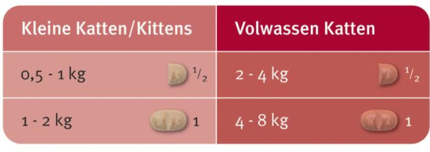 | Aanbeveling | Dosering Kleine katten/kittens 0,5 – 1 kg ½ tablet 1 – 2 kg 1 tablet Volwassen katten |