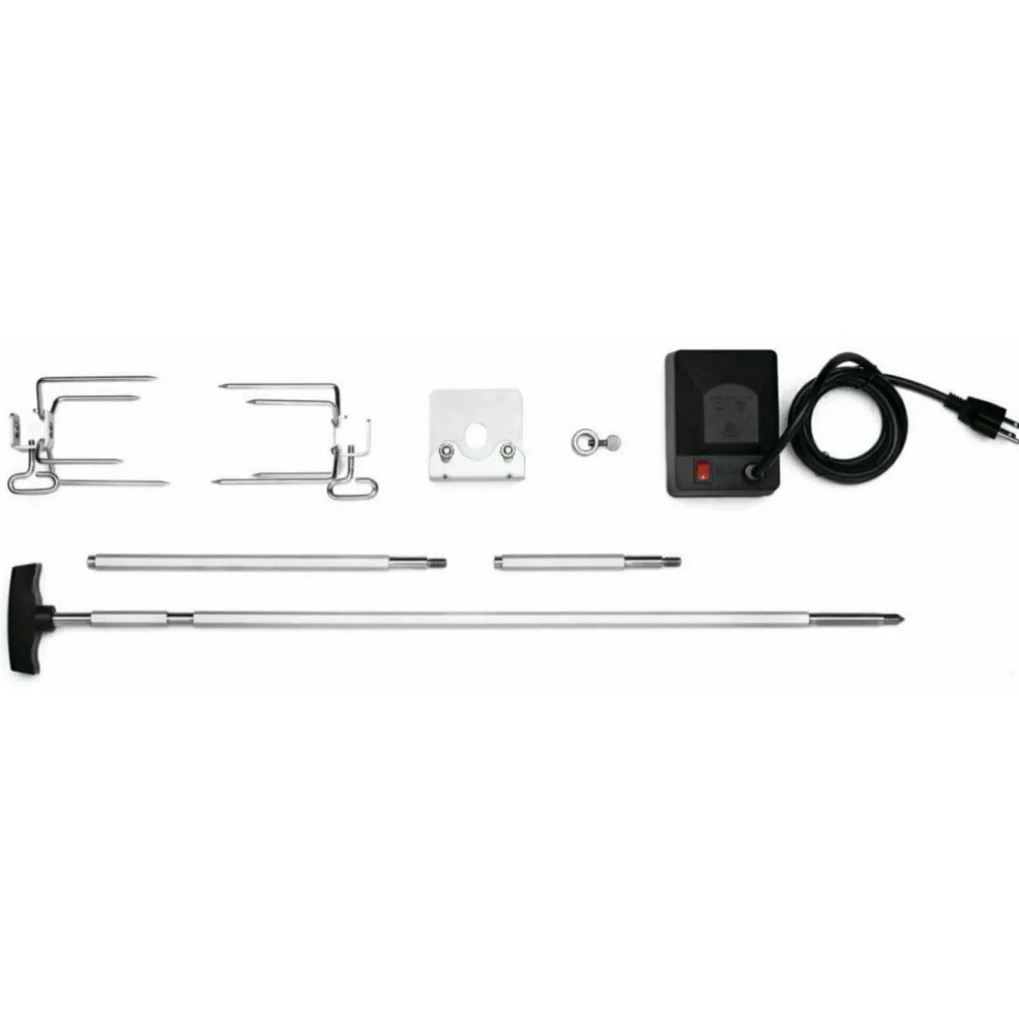 - Het robuuste spit van RVS met krachtige motor kan tot 7 kg aan voedsel dragen en roteren, de kit bevat: 1 krachtige draaispitmotor, 1 spit van RVS, 2 grote draaispitvorken, 1 contragewichtset, 1 klem, 1 T-vormig handvat en een bevestigingsbeugel