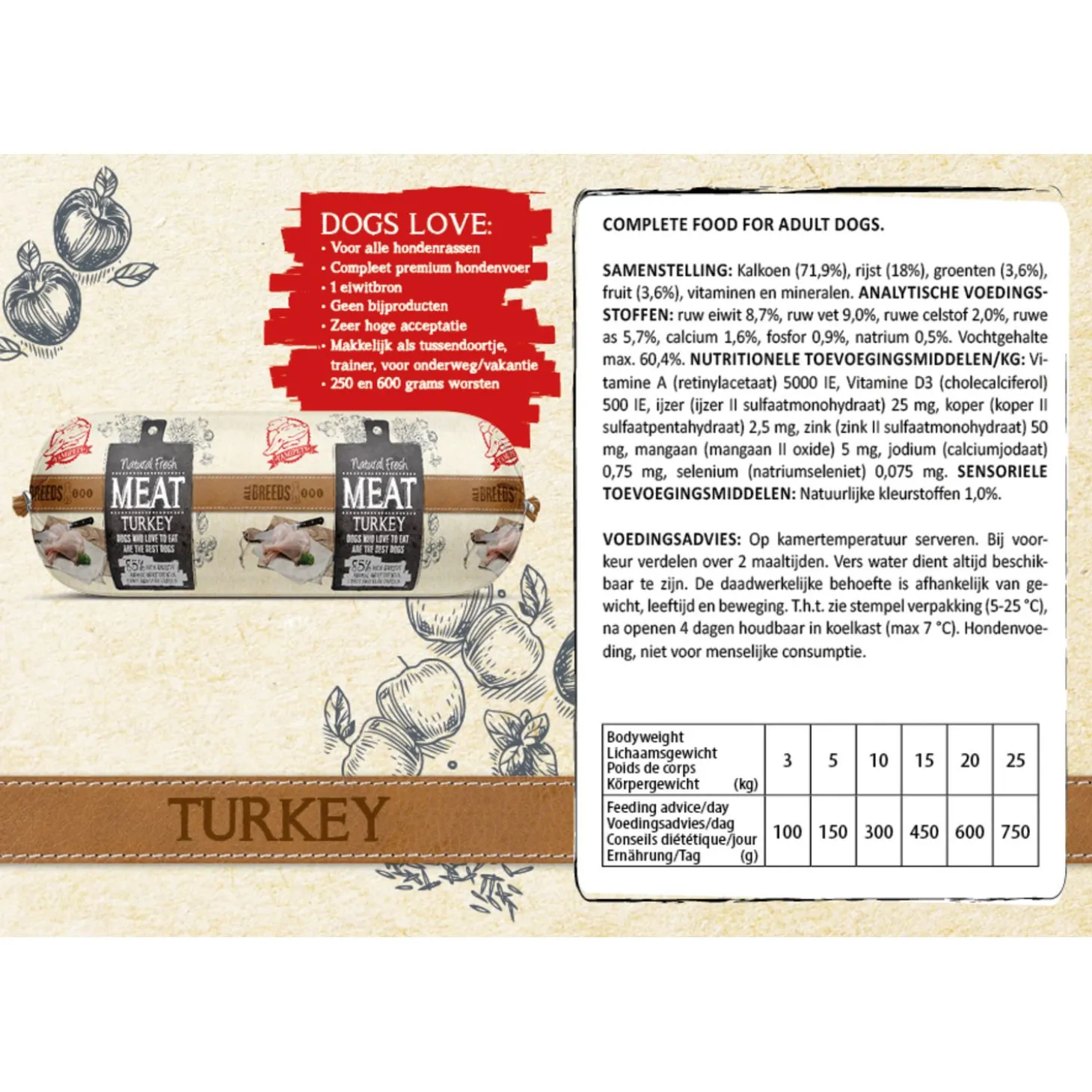 De worsten zijn gebaseerd op 1 eiwitbron, zonder bijproducten. Je kunt kiezen uit kip, kalkoen, konijn, eend, hert en lam. Deze variant bevat kalkoen.