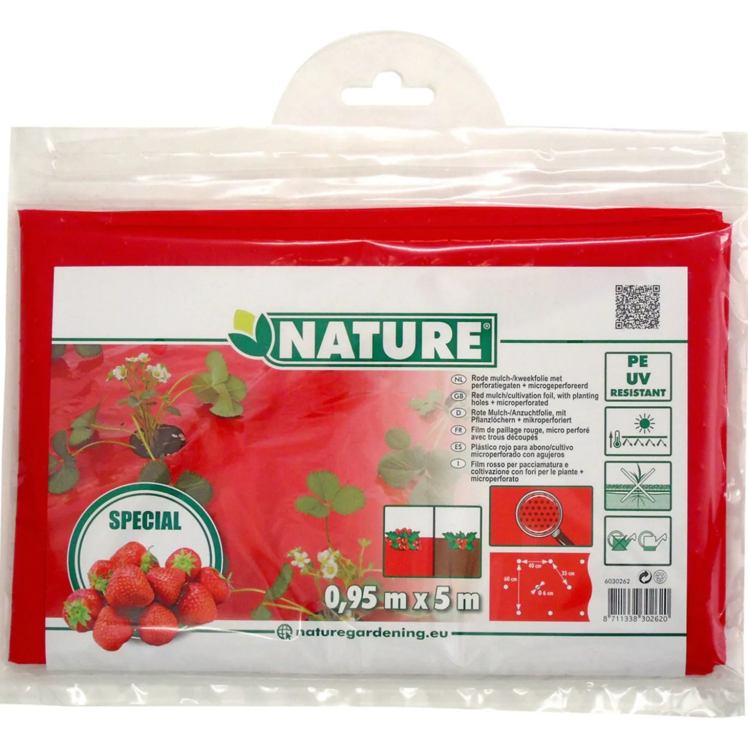Deze rode Kweekfolie Aardbei met perforatiegaten van Nature is speciaal ontwikkeld voor aardbeien. Deze folie bespaart jou enorm veel tijd als je jouw eigen fruit wilt kweken! De gaten zitten er namelijk al in. Dit is de ideale kweekfolie waarmee je alle soorten gewassen direct op de juiste afstand van elkaar kunt planten. Naast dat het je tijd bespaart, zal ook de grond minder snel uitdrogen en hou jij onkruid en ongedierte op afstand! Deze folie bevat microscopisch kleine gaten zodat het water overal door de folie kan sijpelen en het de bewatering van de kroonwortel van de aardbeiplanten vergemakkelijkt. De rode kleur heeft de eigenschap om rode golven uit het lichtspectrum te weerkaatsen die de zachtheid en het suikergehalte van fruit beïnvloeden, en verhoogt de opbrengst met 12 tot 20%. Deze folie wordt aanbevolen voor het kweken van alle soorten aardbeien: vier-seizoensplanten, doordragers of eenjarigen
