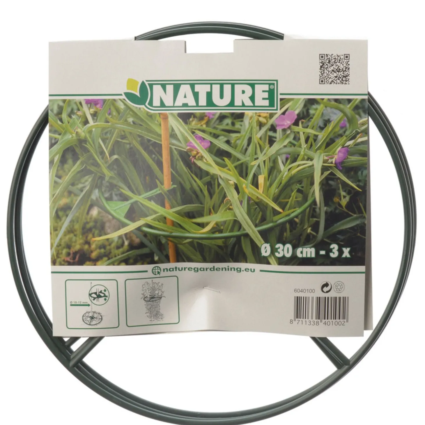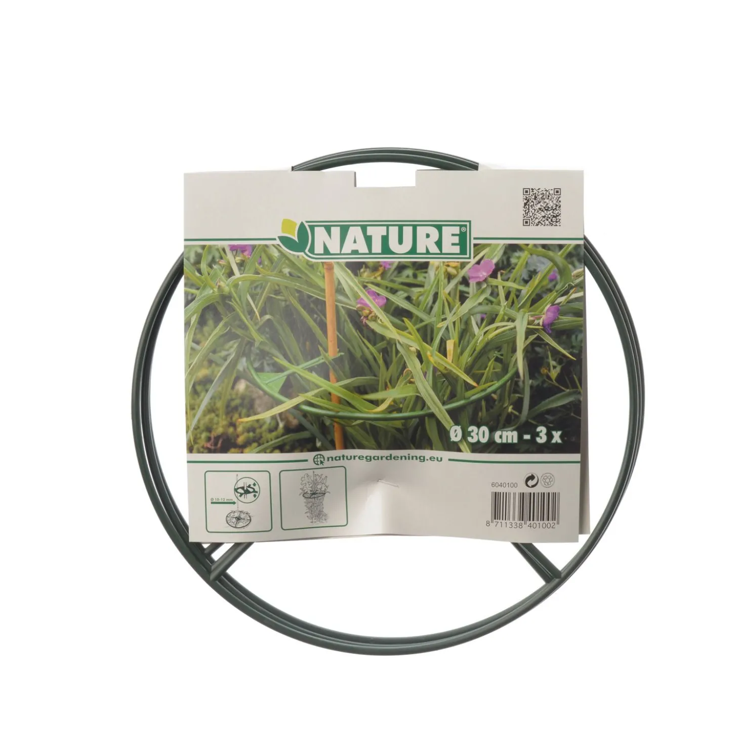 Sommige planten/bomen/struiken hebben ondersteuning nodig tijdens het groeiproces of daarna om niet te gaan doorhangen. De groene Plantensteun van Nature helpt hierbij. Want wie wilt er nou niet genieten van mooie hoge bloeiende planten in de tuin! Je plaatst de steun in de juiste positie om jouw plant zo de meeste steun te geven. De steunen zijn gemaakt van verzinkt staal met een coating, zo zullen de steunen niet roesten.