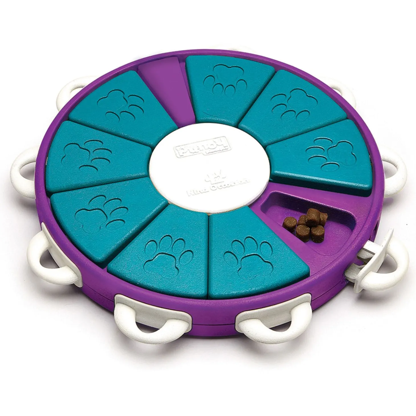 De hondenpuzzel heeft de kleuren paars, blauw en wit en bevat 9 compartimenten waar je snoepjes in kunt verstoppen. Met de blauwe schuiven zijn de meeste compartimenten afgedekt. Met de witte handvaten kunnen deze schuifjes op slot worden gezet. Je hond moet dan eerst de handvaten naar buiten trekken voordat hij het schuifje kan verplaatsen en de snoepjes kan vinden.