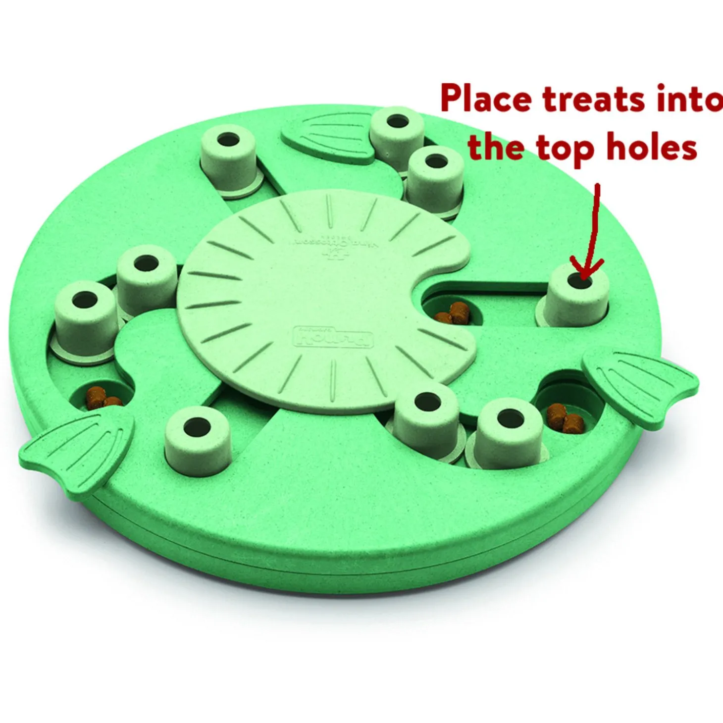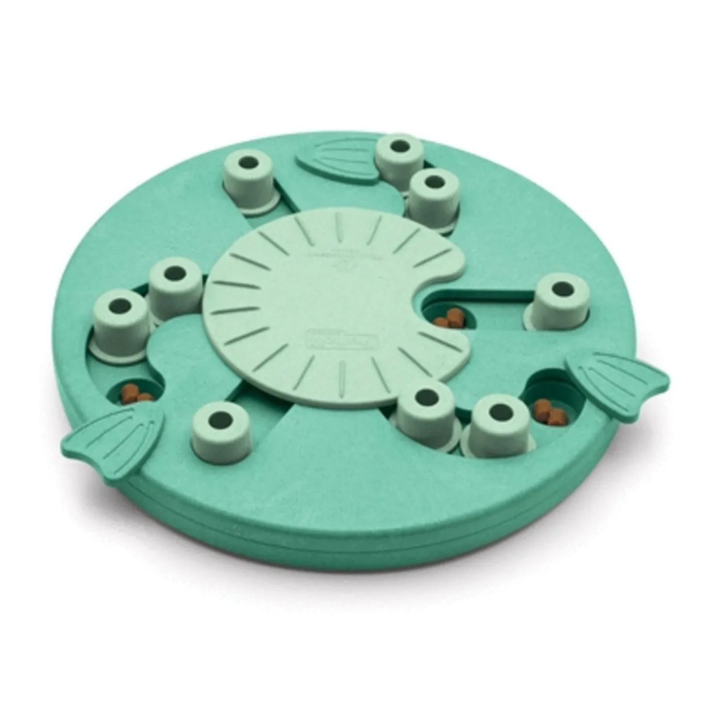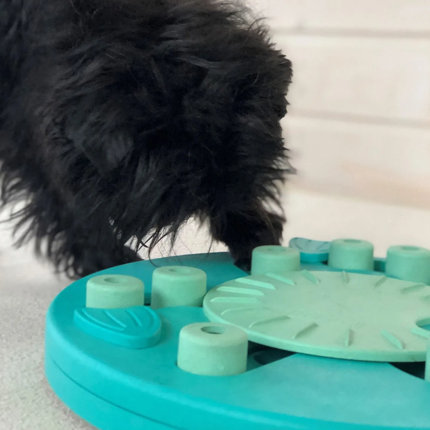 De hondenpuzzel heeft de kleur mintgroen en bevat verschillende soorten compartimenten waar je snoepjes in kunt verstoppen. Met de schuifjes in de vorm van flippers en de grote draaischijf kan je een aantal compartimenten afdekken. Doordat er verschillende mogelijkheden zijn om snoepjes te verstoppen, kan je het steeds een beetje moeilijker maken voor je hond! Hierdoor is het geschikt voor zowel beginners als gevorderden. Laat eerst zien aan je hond waar je de snoepjes hebt verstopt en het speuren kan beginnen!