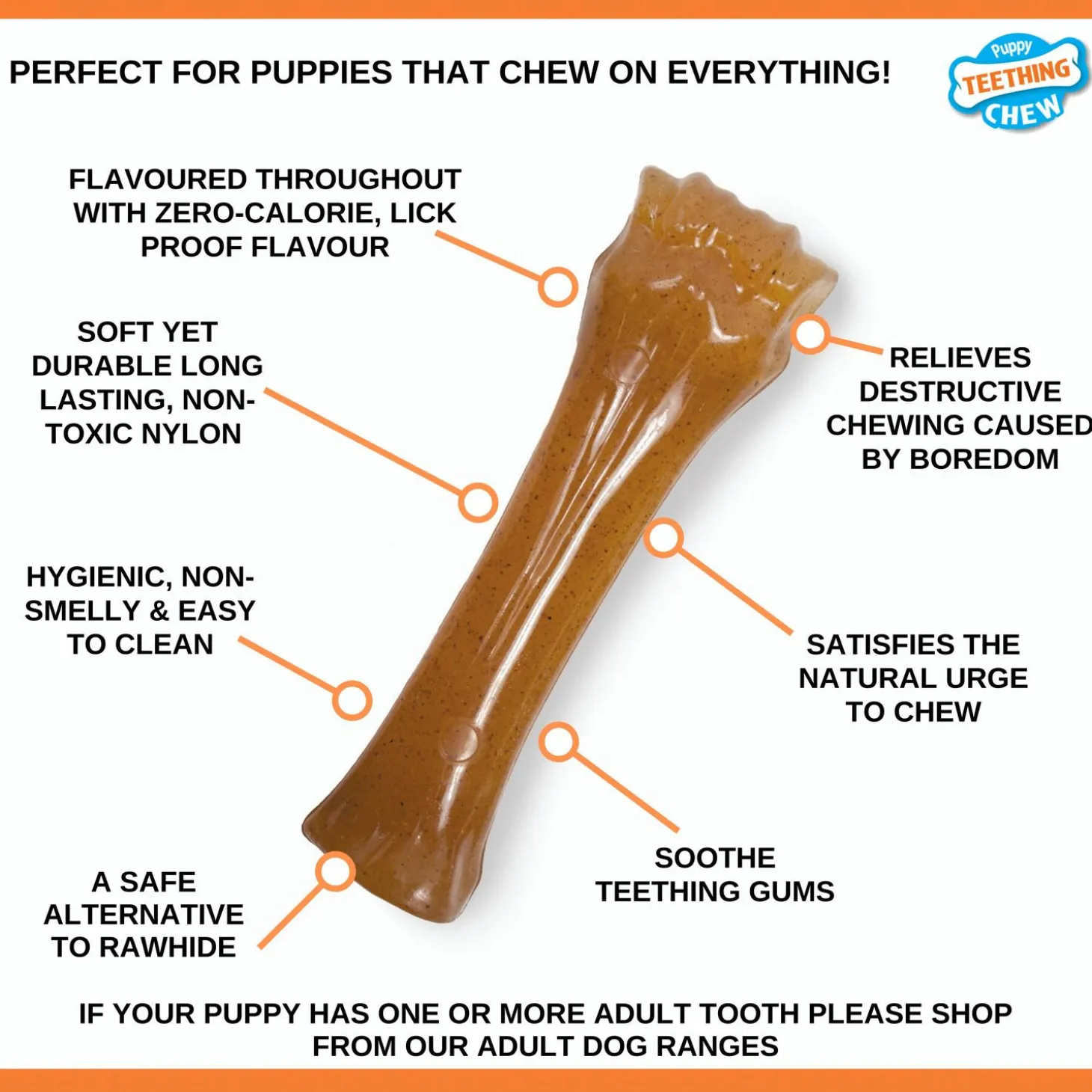 De Flexible Puppy Bone is geschikt voor puppy’s met een volwassen gewicht tot en met 30 kg. Het bot is niet geschikt voor puppy’s waarvan het gebit al aan het wisselen is. Het is de ideale combinatie tussen een speeltje en een kauwbot. De Nylabone is perfect te gebruiken bij verveling of stress maar ook om extreem kauwgedrag – zoals het kauwen aan meubels – tegen te gaan.