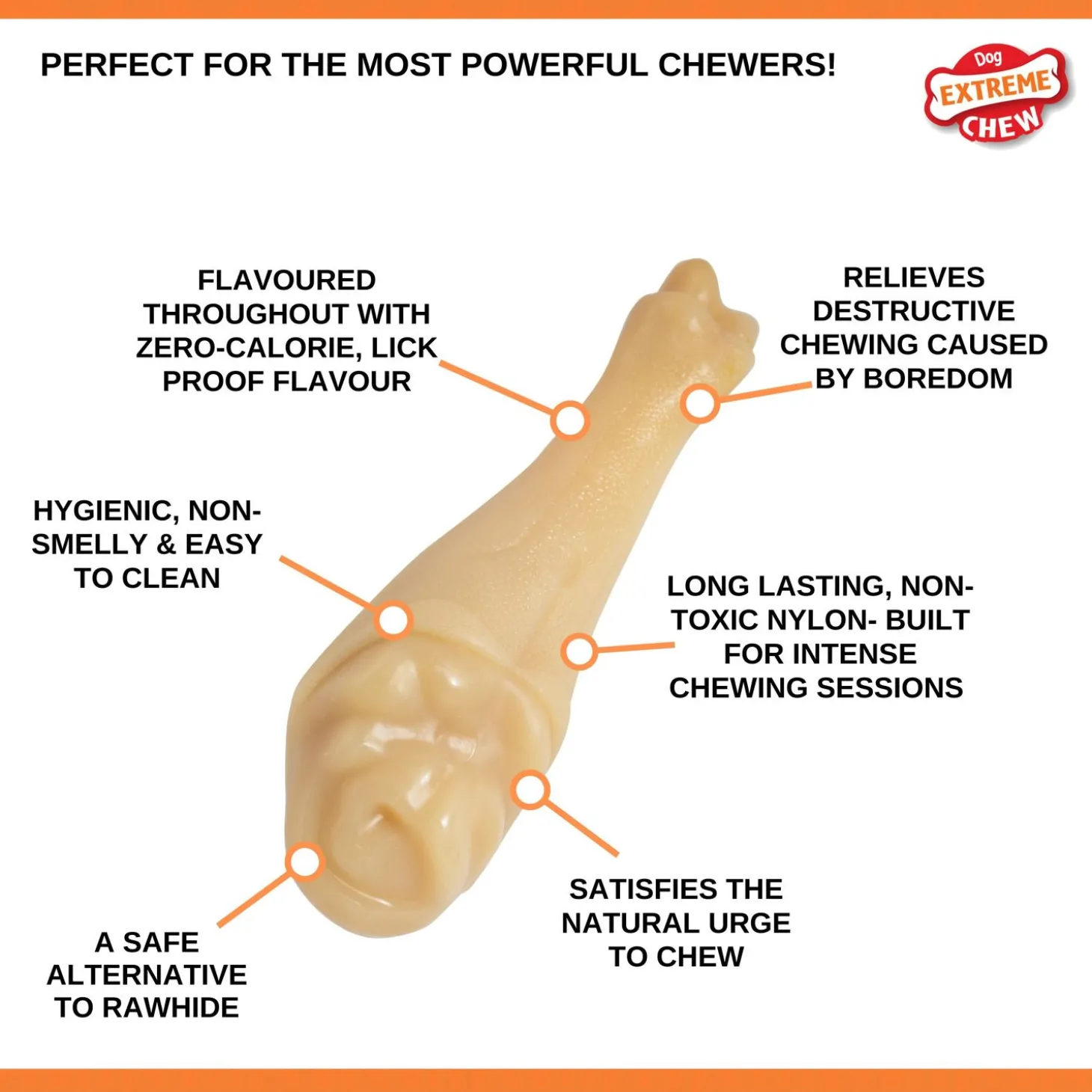 Honden hebben een sterk gebit waarmee ze goed kunnen kauwen. Een kauwsnack gemaakt van natuurlijk materiaal eten ze vaak snel op, zo hebben ze er maar kort plezier van. Met de Power Chew Turkey Leg XXL van Nylabone houd je jouw hond wel even bezig!