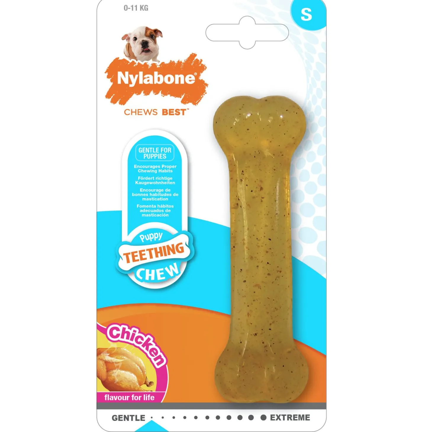 De Flexible Puppy Bone is geschikt voor puppy’s met een volwassen gewicht tot ongeveer 11 kg (maat S) of tot ongeveer 16 kg (maat M). Het bot is niet geschikt voor puppy’s waarvan het gebit al aan het wisselen is. Het is de ideale combinatie tussen een speeltje en een kauwbot. De Nylabone is perfect te gebruiken bij verveling of stress maar ook om extreem kauwgedrag – zoals het kauwen aan meubels – tegen te gaan.