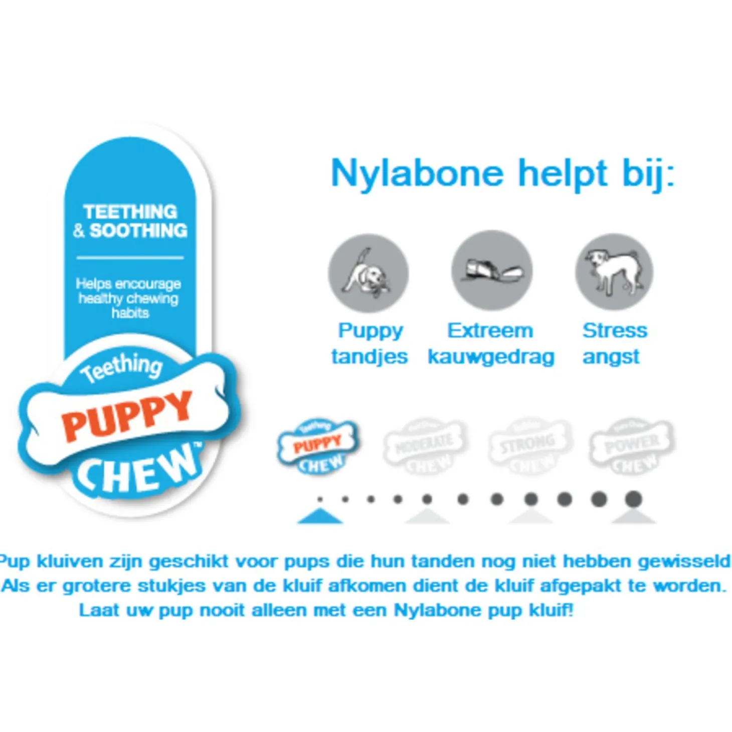 Dit starterspakket is voor pups met een volwassen lichaamsgewicht tot 11kg, dus voor kleinere rassen. De blauwe dental bone en bruine puppy bone zijn alleen geschikt tot het wisselen. Voor na het wisselen is er de witte extreme Nylabone.