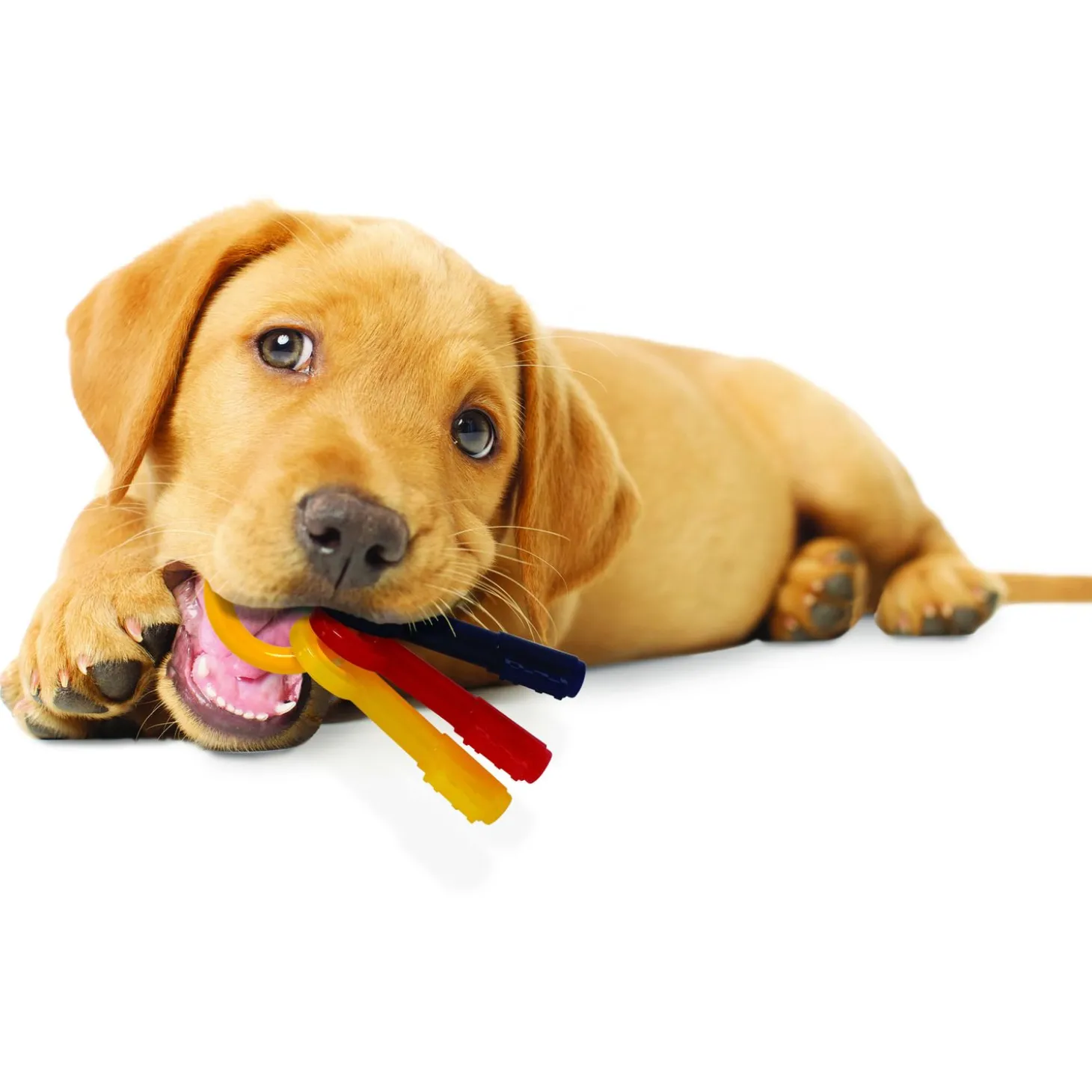 Puppy’s hebben de neiging om overal op te kauwen en knabbelen, al helemaal wanneer ze hun puppytanden aan het wisselen zijn. Een kauwsnack gemaakt van natuurlijk materiaal eten ze vaak snel op, zo hebben ze er maar kort plezier van. Met de Flexible Puppy Teething keys van Nylabone houd je jouw pup wel even bezig!