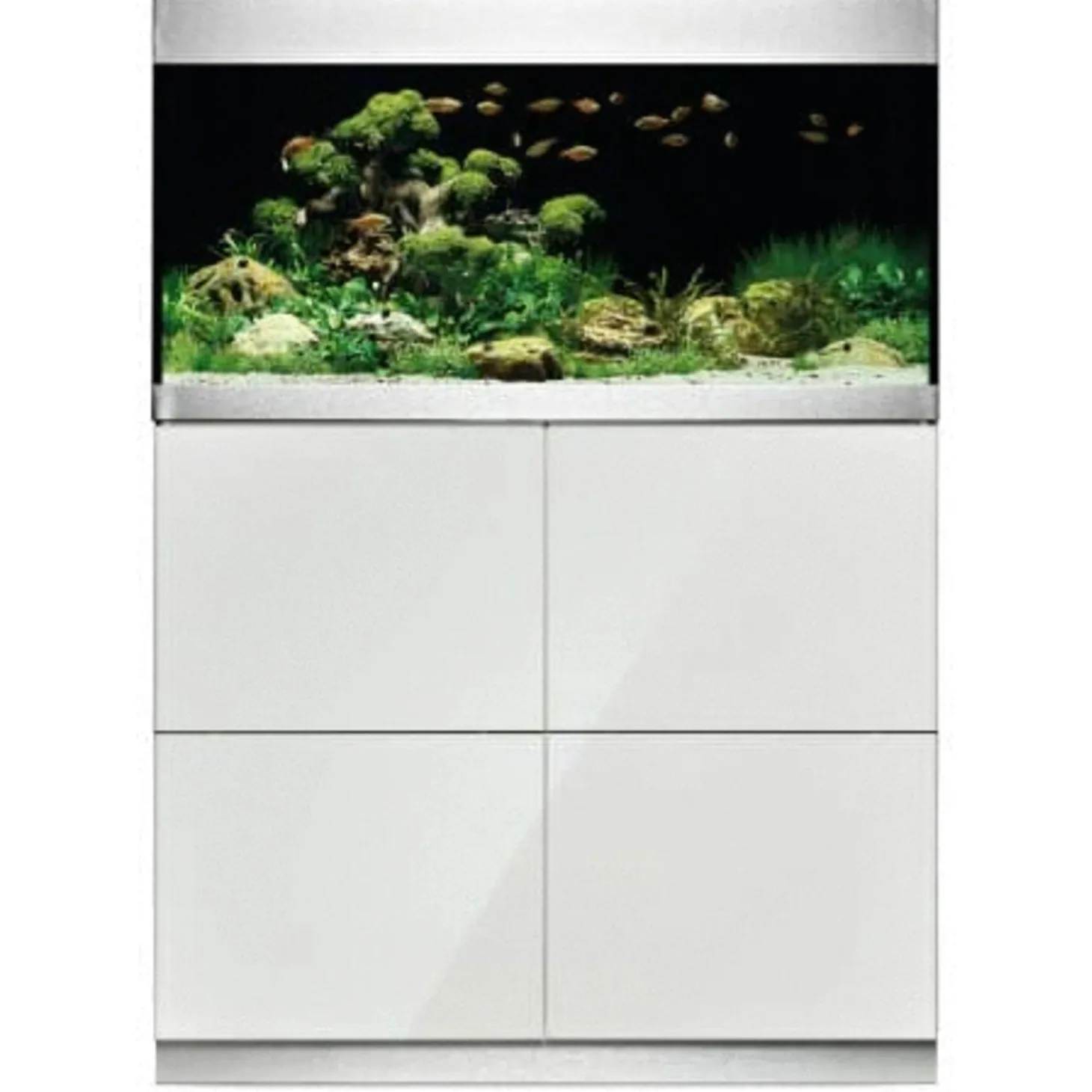 Het aquarium straalt design uit en vormt een modern geheel in combinatie met de kast. Storende slangen en kabels zijn perfect weggewerkt en de Oase filters (niet inbegrepen) zijn onderhoudsarm. Het aquarium is voorzien van een strakke, aluminium afwerking met een volledig open te maken deksel. Ook bevat het een afwerkrand voor het grind en de waterlijn. Verlichting niet inbegrepen.